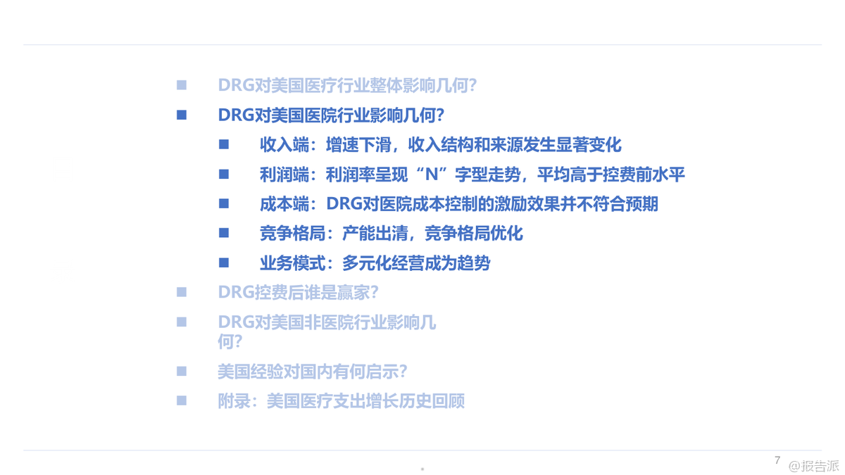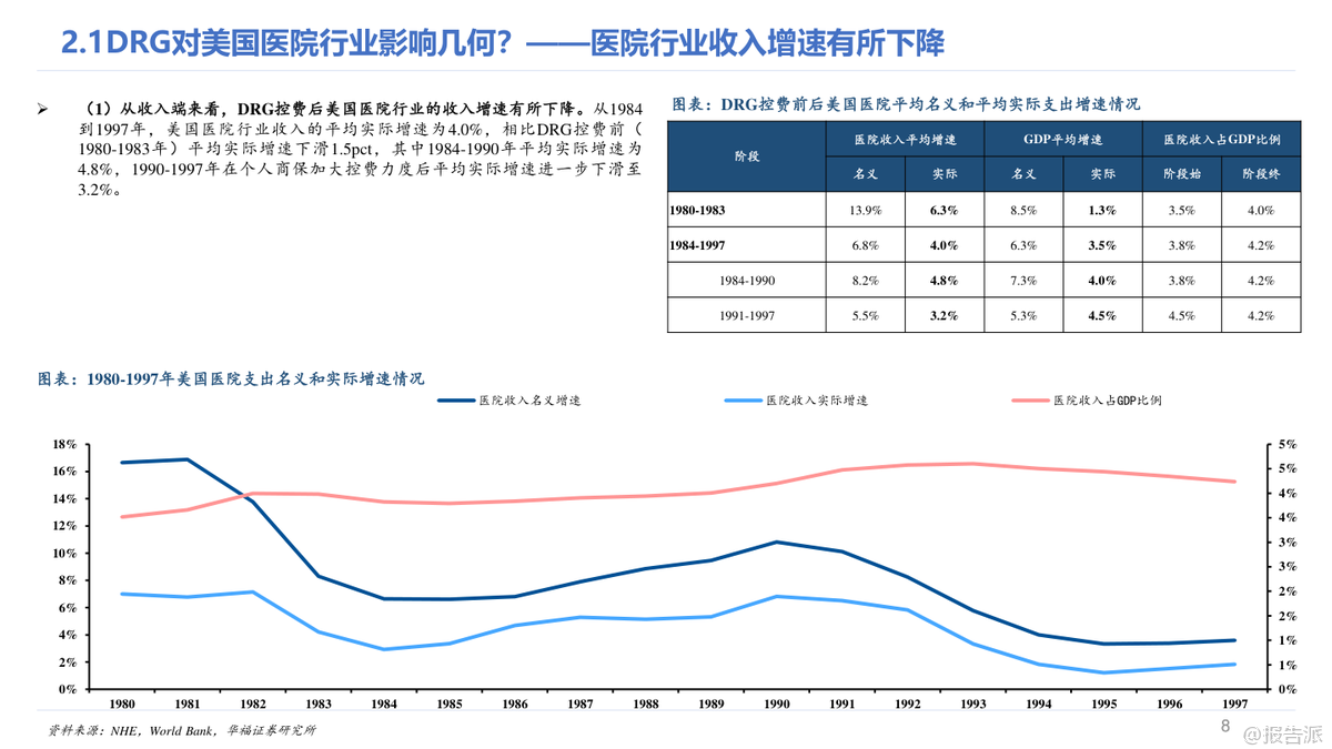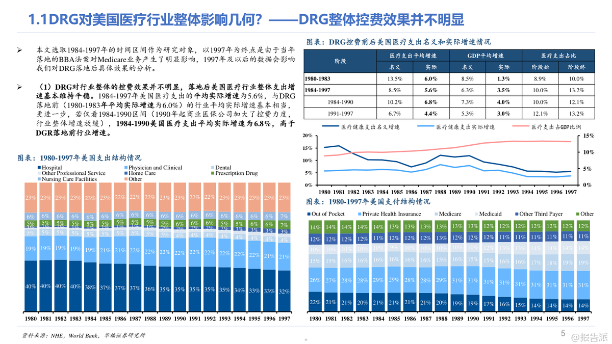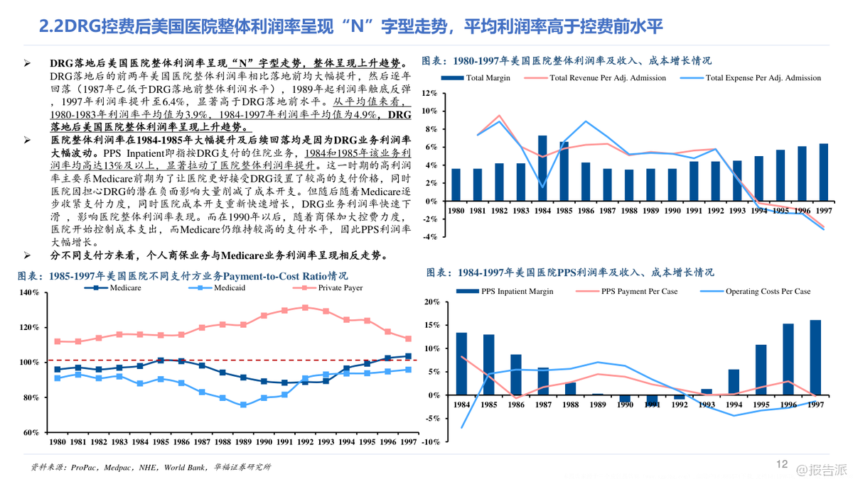 本報告深入探討了美國在1984年至1997年間實施DRG(按診斷相關(guān)分組)對醫(yī)療行業(yè)的整體影響及細(xì)分領(lǐng)域的影響。 從整體來看,DRG的控費效果并不顯著,美國醫(yī)療支出的實際增速基本維持平穩(wěn),僅在Medicare方面實現(xiàn)了良好的控費目標(biāo),而其他支付方如自費、個人商保等則承擔(dān)了更大的支出壓力。 具體到醫(yī)院行業(yè),DRG控費后美國醫(yī)院收入增速有所下降,但業(yè)務(wù)模式逐漸向多元化發(fā)展,門診業(yè)務(wù)量價齊升成為新的增長點。 同時,醫(yī)院的成本控制并未達到預(yù)期,反而通過將成本轉(zhuǎn)移至商業(yè)保險來維持較高的利潤率。 此外,醫(yī)院數(shù)量出現(xiàn)減少,尤其是小體量和公立醫(yī)院面臨較大沖擊,而營利性私立醫(yī)院表現(xiàn)突出。 對于非醫(yī)院行業(yè),DRG控費帶來了不同的影響。 醫(yī)生支出呈現(xiàn)加速增長趨勢,急性期后護理機構(gòu)(如康復(fù)、專業(yè)護理、家庭護理等)迎來了高速發(fā)展,主要得益于更優(yōu)的支付模式以及醫(yī)院對其需求的轉(zhuǎn)移。 處方藥銷售增速在控費后也有所提升,這與商業(yè)保險逐步承擔(dān)更多藥品支付壓力有關(guān),同時新設(shè)備和新技術(shù)的推廣并未受到明顯抑制。 值得注意的是,不同類型的醫(yī)院在DRG控費后的表現(xiàn)差異顯著。 鄉(xiāng)村醫(yī)院優(yōu)于城市醫(yī)院,市場地位高的醫(yī)院優(yōu)于市場地位低的醫(yī)院,營利性私立醫(yī)院優(yōu)于非營利性和公立醫(yī)院。 管理能力強的醫(yī)院也更能適應(yīng)DRG帶來的變化。 這些差異的核心原因在于醫(yī)院所處的競爭環(huán)境、成本控制能力、議價能力和領(lǐng)導(dǎo)力等因素。 從長期看,雖然短期內(nèi)DRG可能對國內(nèi)醫(yī)療行業(yè)帶來較大沖擊,但中長期行業(yè)增速有望回歸正常。 參考美國經(jīng)驗,政府加大對醫(yī)療行業(yè)的財政投入以及商業(yè)健康險的發(fā)展可能成為行業(yè)反彈的重要路徑。 在國內(nèi)環(huán)境下,醫(yī)療機構(gòu)可能面臨更大的控費壓力,因此競爭格局優(yōu)化、領(lǐng)先者市場份額持續(xù)提升的趨勢值得期待。 非醫(yī)院醫(yī)療行業(yè)預(yù)計將迎來需求快速增長階段,特別是ICL(獨立臨床實驗室)行業(yè)可能實現(xiàn)滲透率和集中度的雙重提升。 盡管DRG對創(chuàng)新技術(shù)推廣存在擔(dān)憂,但從美國經(jīng)驗來看,這種擔(dān)憂可能是多余的,因為新技術(shù)帶來的邊際成本較低且支付方通常提供額外補貼。 總結(jié)而言,DRG控費政策在美國醫(yī)療行業(yè)中的實際效果因不同領(lǐng)域和支付結(jié)構(gòu)而異。 對于國內(nèi)醫(yī)療行業(yè)來說,借鑒美國經(jīng)驗可以更好地預(yù)測和應(yīng)對政策帶來的挑戰(zhàn),同時也可以發(fā)現(xiàn)潛在的機會。 無論是醫(yī)院還是非醫(yī)院醫(yī)療行業(yè),具備較強成本控制能力、良好管理能力和高市場地位的參與者都更有可能在變革中勝出。 出品方:華福證券研究所 發(fā)布時間:2023年 文檔頁數(shù):未知 |