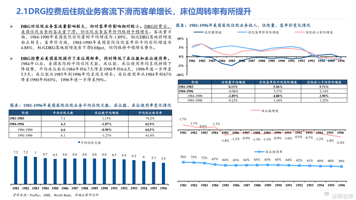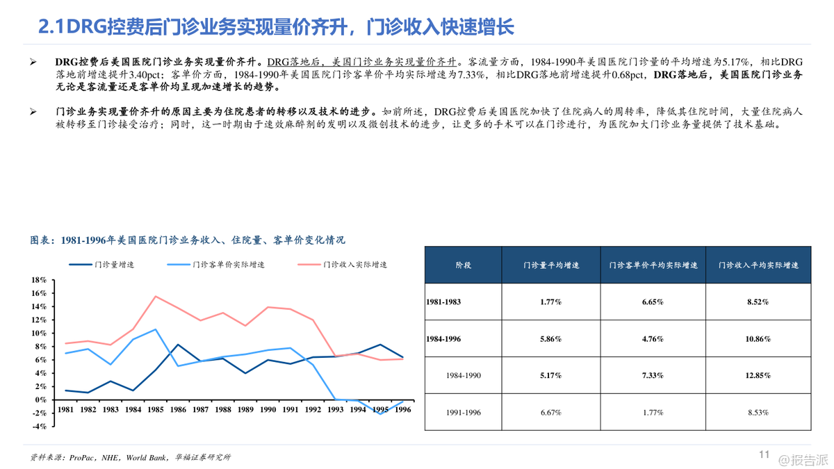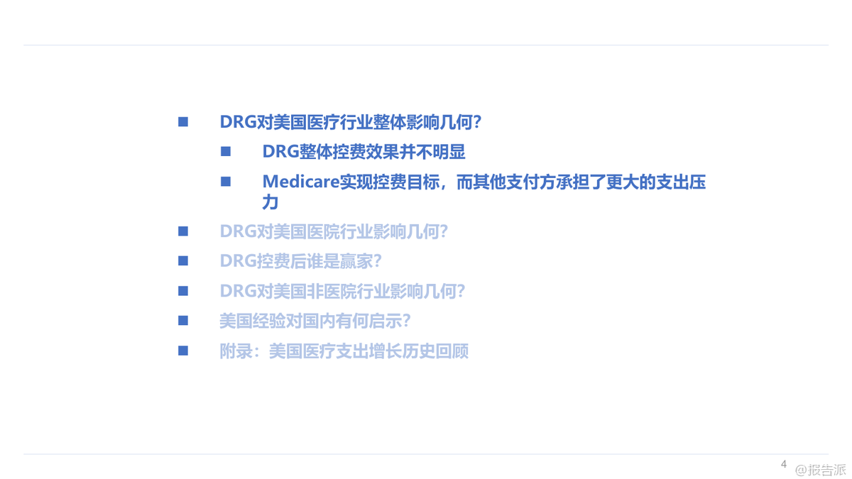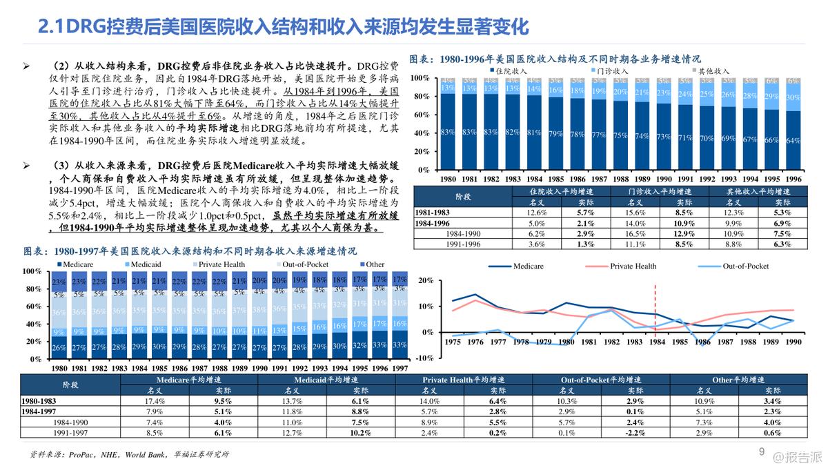 本報告深入探討了美國在1984年至1997年間實施DRG(按診斷相關(guān)分組)對醫(yī)療行業(yè)的整體影響及細(xì)分領(lǐng)域的影響。 從整體來看,DRG的控費效果并不顯著,美國醫(yī)療支出的實際增速基本維持平穩(wěn),僅在Medicare方面實現(xiàn)了良好的控費目標(biāo),而其他支付方如自費、個人商保等則承擔(dān)了更大的支出壓力。 具體到醫(yī)院行業(yè),DRG控費后美國醫(yī)院收入增速有所下降,但業(yè)務(wù)模式逐漸向多元化發(fā)展,門診業(yè)務(wù)量價齊升成為新的增長點。 同時,醫(yī)院的成本控制并未達到預(yù)期,反而通過將成本轉(zhuǎn)移至商業(yè)保險來維持較高的利潤率。 此外,醫(yī)院數(shù)量出現(xiàn)減少,尤其是小體量和公立醫(yī)院面臨較大沖擊,而營利性私立醫(yī)院表現(xiàn)突出。 對于非醫(yī)院行業(yè),DRG控費帶來了不同的影響。 醫(yī)生支出呈現(xiàn)加速增長趨勢,急性期后護理機構(gòu)(如康復(fù)、專業(yè)護理、家庭護理等)迎來了高速發(fā)展,主要得益于更優(yōu)的支付模式以及醫(yī)院對其需求的轉(zhuǎn)移。 處方藥銷售增速在控費后也有所提升,這與商業(yè)保險逐步承擔(dān)更多藥品支付壓力有關(guān),同時新設(shè)備和新技術(shù)的推廣并未受到明顯抑制。 值得注意的是,不同類型的醫(yī)院在DRG控費后的表現(xiàn)差異顯著。 鄉(xiāng)村醫(yī)院優(yōu)于城市醫(yī)院,市場地位高的醫(yī)院優(yōu)于市場地位低的醫(yī)院,營利性私立醫(yī)院優(yōu)于非營利性和公立醫(yī)院。 管理能力強的醫(yī)院也更能適應(yīng)DRG帶來的變化。 這些差異的核心原因在于醫(yī)院所處的競爭環(huán)境、成本控制能力、議價能力和領(lǐng)導(dǎo)力等因素。 從長期看,雖然短期內(nèi)DRG可能對國內(nèi)醫(yī)療行業(yè)帶來較大沖擊,但中長期行業(yè)增速有望回歸正常。 參考美國經(jīng)驗,政府加大對醫(yī)療行業(yè)的財政投入以及商業(yè)健康險的發(fā)展可能成為行業(yè)反彈的重要路徑。 在國內(nèi)環(huán)境下,醫(yī)療機構(gòu)可能面臨更大的控費壓力,因此競爭格局優(yōu)化、領(lǐng)先者市場份額持續(xù)提升的趨勢值得期待。 非醫(yī)院醫(yī)療行業(yè)預(yù)計將迎來需求快速增長階段,特別是ICL(獨立臨床實驗室)行業(yè)可能實現(xiàn)滲透率和集中度的雙重提升。 盡管DRG對創(chuàng)新技術(shù)推廣存在擔(dān)憂,但從美國經(jīng)驗來看,這種擔(dān)憂可能是多余的,因為新技術(shù)帶來的邊際成本較低且支付方通常提供額外補貼。 總結(jié)而言,DRG控費政策在美國醫(yī)療行業(yè)中的實際效果因不同領(lǐng)域和支付結(jié)構(gòu)而異。 對于國內(nèi)醫(yī)療行業(yè)來說,借鑒美國經(jīng)驗可以更好地預(yù)測和應(yīng)對政策帶來的挑戰(zhàn),同時也可以發(fā)現(xiàn)潛在的機會。 無論是醫(yī)院還是非醫(yī)院醫(yī)療行業(yè),具備較強成本控制能力、良好管理能力和高市場地位的參與者都更有可能在變革中勝出。 出品方:華福證券研究所 發(fā)布時間:2023年 文檔頁數(shù):未知 |