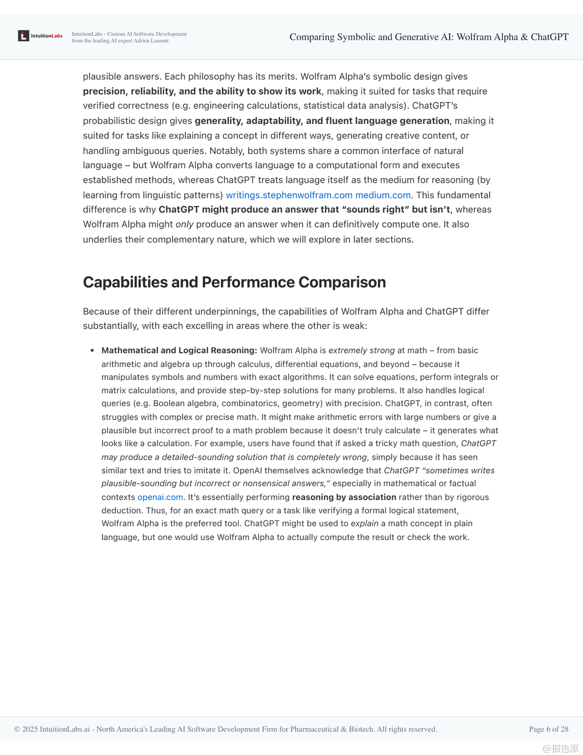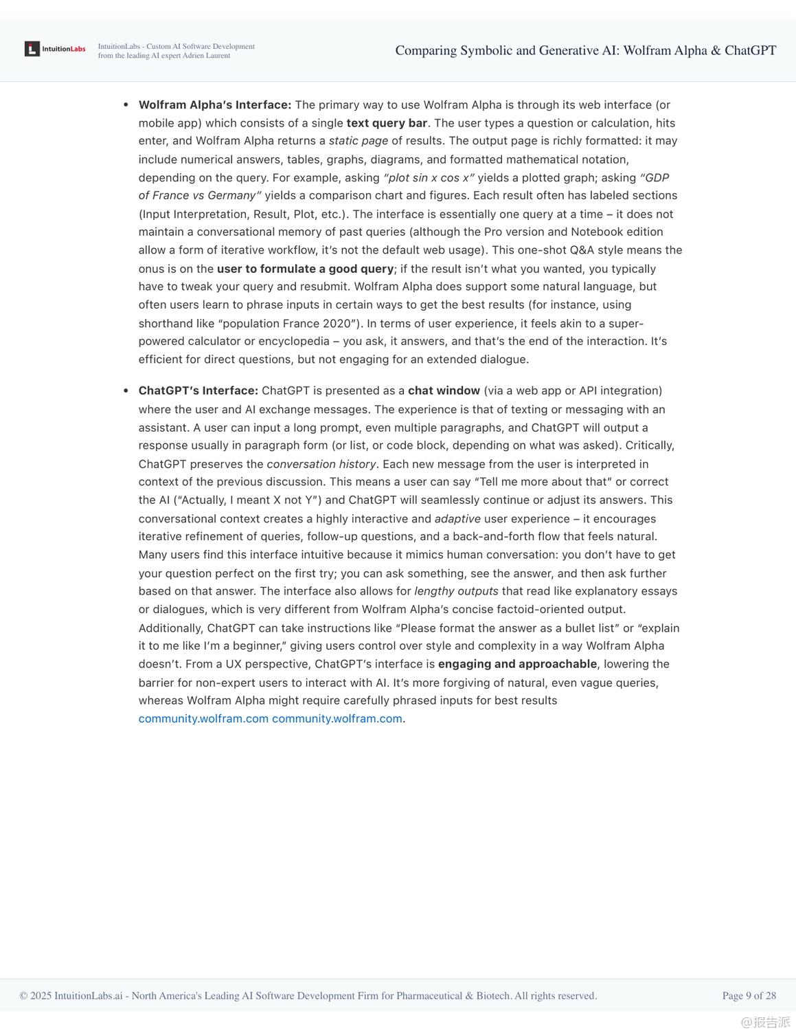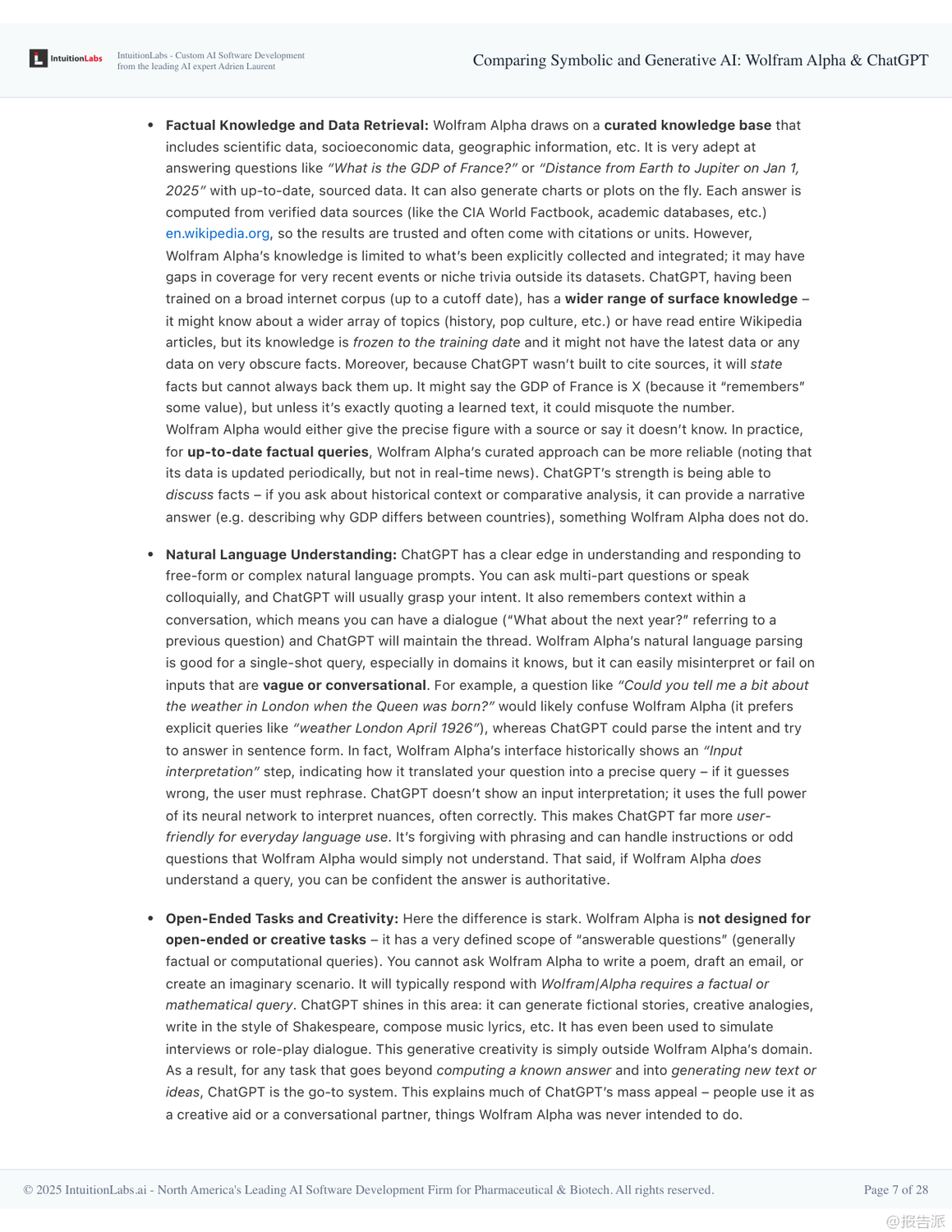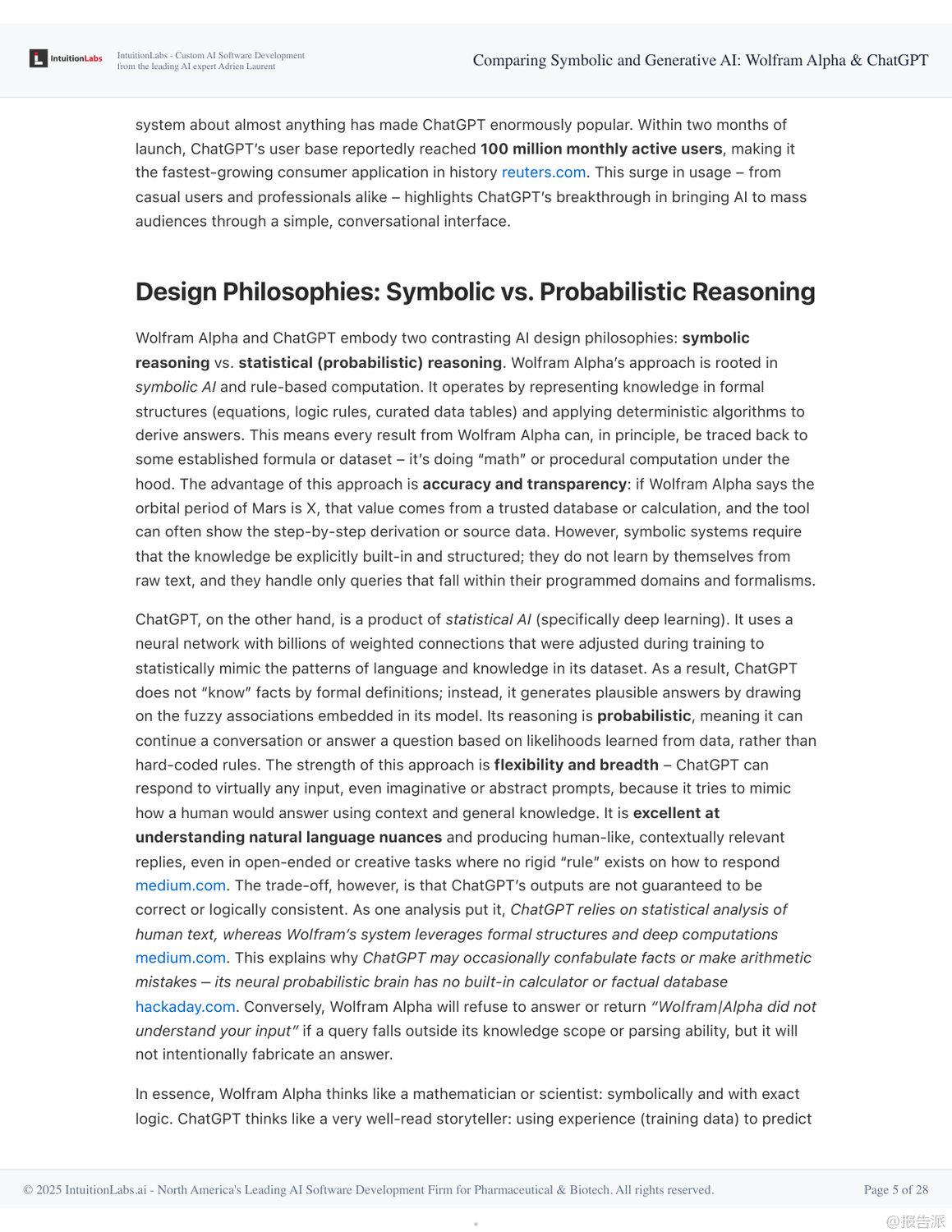 在人工智能技術(shù)快速演進的當(dāng)下,Wolfram Alpha與ChatGPT作為兩種截然不同的AI范式代表,展現(xiàn)出符號AI與生成式AI的核心差異與互補潛力。 本報告深入剖析了二者的技術(shù)架構(gòu)、設(shè)計哲學(xué)、應(yīng)用場景及未來融合趨勢,揭示了下一代智能系統(tǒng)的演進方向。 Wolfram Alpha誕生于2009年,是典型的符號AI系統(tǒng),被稱為“計算知識引擎”。 其核心在于通過形式化算法對結(jié)構(gòu)化數(shù)據(jù)進行精確計算,而非檢索已有信息。 它依托Wolfram語言和Mathematica積累的龐大算法庫,將自然語言查詢轉(zhuǎn)化為可執(zhí)行的數(shù)學(xué)或邏輯運算,從而得出權(quán)威、可追溯的答案。 例如求解積分、查詢天文距離或經(jīng)濟數(shù)據(jù)時,結(jié)果均來自內(nèi)置模型和可信數(shù)據(jù)庫,并能展示推導(dǎo)步驟,確保準(zhǔn)確性與透明度。 這種“玻璃盒”式的推理機制使其在教育、科研和工程領(lǐng)域廣受信賴。 相比之下,ChatGPT則是生成式AI的典范,基于大規(guī)模語言模型(LLM)和海量文本訓(xùn)練而成。 它不依賴預(yù)設(shè)規(guī)則,而是通過統(tǒng)計模式預(yù)測下一個詞,實現(xiàn)類人對話。 得益于強化學(xué)習(xí)與人類反饋(RLHF),ChatGPT具備出色的自然語言理解和上下文記憶能力,能夠撰寫文章、創(chuàng)作詩歌、解釋概念甚至編寫代碼。 然而,其“黑箱”特性也導(dǎo)致可能出現(xiàn)事實性錯誤或虛構(gòu)信息(即“幻覺”),缺乏內(nèi)在驗證機制。 兩者的設(shè)計哲學(xué)形成鮮明對比:Wolfram Alpha像一位嚴(yán)謹(jǐn)?shù)目茖W(xué)家,追求確定性和可解釋性;而ChatGPT更像一位博學(xué)的故事講述者,擅長靈活表達與創(chuàng)造性回應(yīng)。 這也決定了它們的能力邊界——前者精于數(shù)學(xué)、邏輯與數(shù)據(jù)查詢,后者勝在開放問答、創(chuàng)意生成與交互體驗。 盡管Wolfram Alpha技術(shù)領(lǐng)先,但其用戶界面單一、學(xué)習(xí)成本較高、應(yīng)用范圍有限,未能實現(xiàn)大眾化普及。 反觀ChatGPT憑借對話式交互、零門檻使用和廣泛適用性,在發(fā)布兩個月內(nèi)即突破億級用戶,成為現(xiàn)象級產(chǎn)品。 真正的轉(zhuǎn)折點出現(xiàn)在兩者的融合。 自2023年起,OpenAI推出插件系統(tǒng),允許ChatGPT調(diào)用Wolfram Alpha進行精確計算。 這一集成使ChatGPT獲得“計算超能力”,可在回答涉及數(shù)學(xué)、科學(xué)或?qū)崟r數(shù)據(jù)的問題時,自動調(diào)用Wolfram引擎獲取可靠結(jié)果,并以自然語言呈現(xiàn)。 這不僅彌補了生成式AI的事實缺陷,也讓符號AI得以通過友好界面觸達更廣泛人群。 展望未來,單一模式的AI已難以滿足復(fù)雜需求。 報告指出,混合架構(gòu)將成為主流:以大語言模型為“大腦”負(fù)責(zé)理解與溝通,協(xié)同專業(yè)工具如Wolfram Alpha完成高精度任務(wù)。 這種“AI代理+工具調(diào)用”的模式,標(biāo)志著從孤立智能向復(fù)合智能的躍遷。 同時,可解釋性、可信計算與人類監(jiān)督的重要性將進一步凸顯。 最終,AI的發(fā)展方向并非取代人類,而是構(gòu)建人機協(xié)同的認(rèn)知增強體系,讓機器處理計算與信息整合,人類專注于提問、判斷與創(chuàng)新。 出品方:IntuitionLabs 發(fā)布時間:2025年 文檔頁數(shù):28頁 |