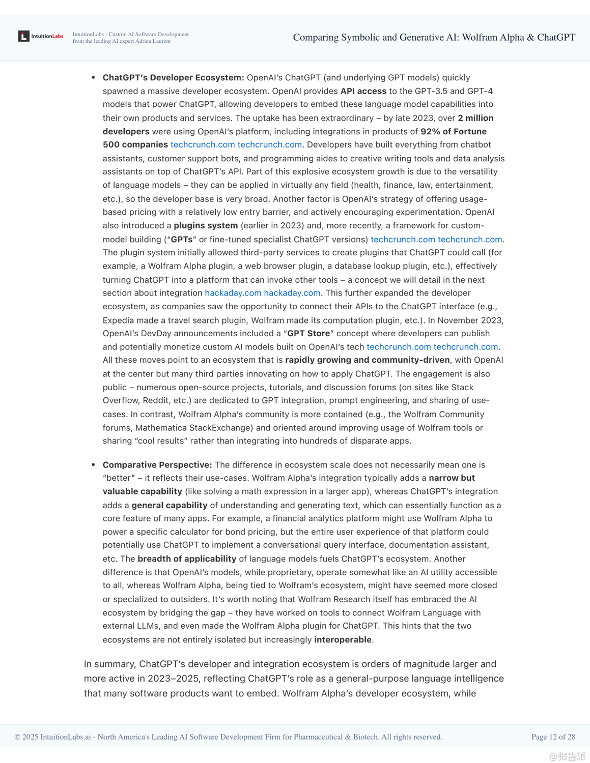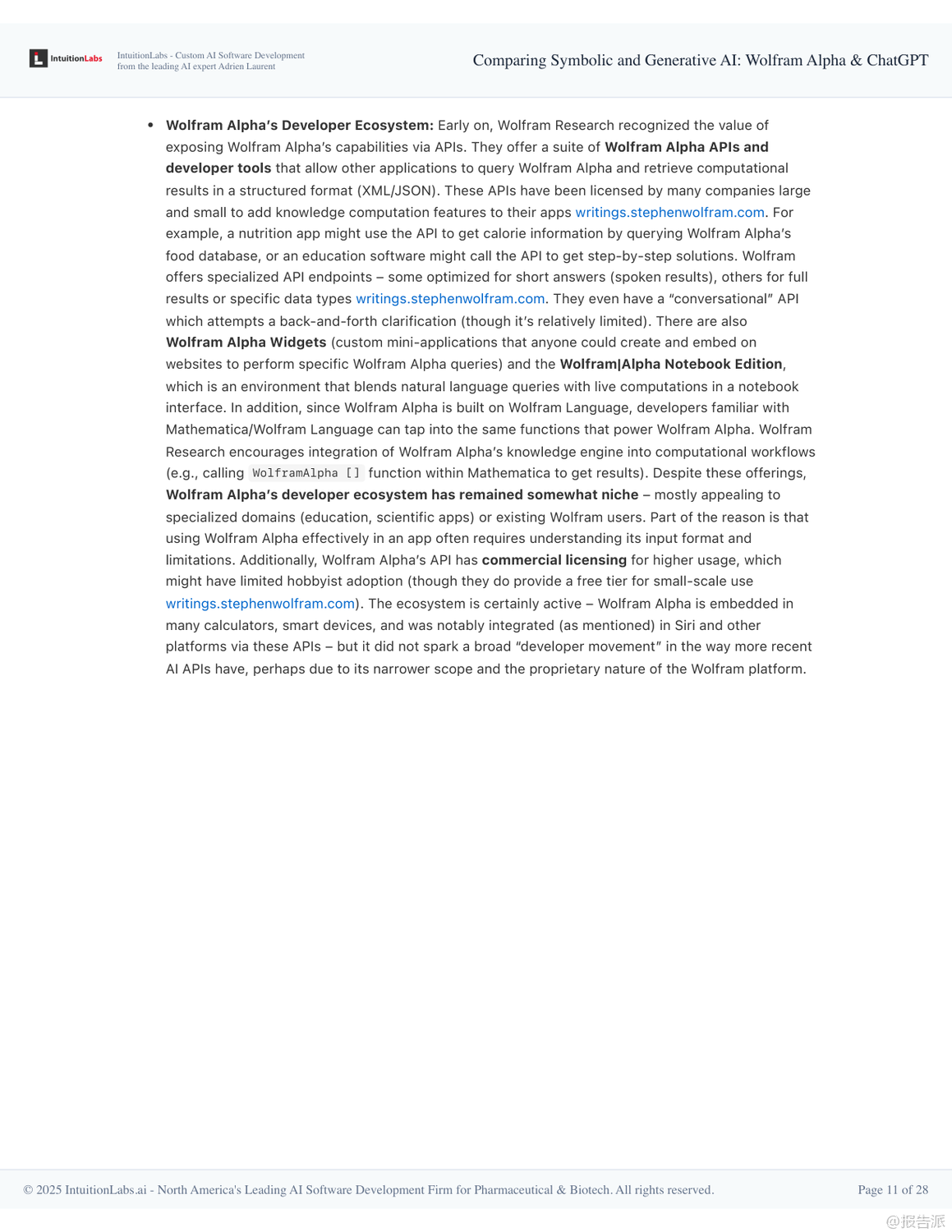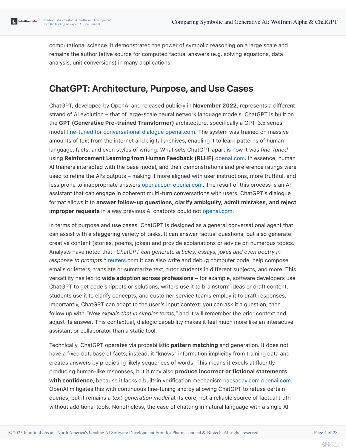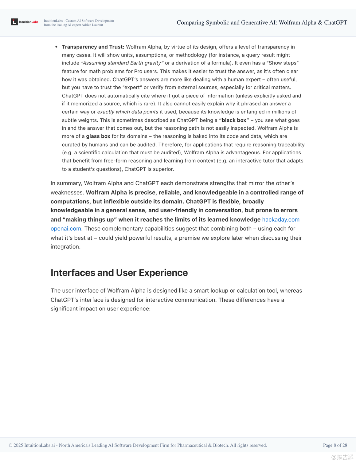 在人工智能技術(shù)快速演進的當(dāng)下,Wolfram Alpha與ChatGPT作為兩種截然不同的AI范式代表,展現(xiàn)出符號AI與生成式AI的核心差異與互補潛力。 本報告深入剖析了二者的技術(shù)架構(gòu)、設(shè)計哲學(xué)、應(yīng)用場景及未來融合趨勢,揭示了下一代智能系統(tǒng)的演進方向。 Wolfram Alpha誕生于2009年,是典型的符號AI系統(tǒng),被稱為“計算知識引擎”。 其核心在于通過形式化算法對結(jié)構(gòu)化數(shù)據(jù)進行精確計算,而非檢索已有信息。 它依托Wolfram語言和Mathematica積累的龐大算法庫,將自然語言查詢轉(zhuǎn)化為可執(zhí)行的數(shù)學(xué)或邏輯運算,從而得出權(quán)威、可追溯的答案。 例如求解積分、查詢天文距離或經(jīng)濟數(shù)據(jù)時,結(jié)果均來自內(nèi)置模型和可信數(shù)據(jù)庫,并能展示推導(dǎo)步驟,確保準(zhǔn)確性與透明度。 這種“玻璃盒”式的推理機制使其在教育、科研和工程領(lǐng)域廣受信賴。 相比之下,ChatGPT則是生成式AI的典范,基于大規(guī)模語言模型(LLM)和海量文本訓(xùn)練而成。 它不依賴預(yù)設(shè)規(guī)則,而是通過統(tǒng)計模式預(yù)測下一個詞,實現(xiàn)類人對話。 得益于強化學(xué)習(xí)與人類反饋(RLHF),ChatGPT具備出色的自然語言理解和上下文記憶能力,能夠撰寫文章、創(chuàng)作詩歌、解釋概念甚至編寫代碼。 然而,其“黑箱”特性也導(dǎo)致可能出現(xiàn)事實性錯誤或虛構(gòu)信息(即“幻覺”),缺乏內(nèi)在驗證機制。 兩者的設(shè)計哲學(xué)形成鮮明對比:Wolfram Alpha像一位嚴(yán)謹(jǐn)?shù)目茖W(xué)家,追求確定性和可解釋性;而ChatGPT更像一位博學(xué)的故事講述者,擅長靈活表達與創(chuàng)造性回應(yīng)。 這也決定了它們的能力邊界——前者精于數(shù)學(xué)、邏輯與數(shù)據(jù)查詢,后者勝在開放問答、創(chuàng)意生成與交互體驗。 盡管Wolfram Alpha技術(shù)領(lǐng)先,但其用戶界面單一、學(xué)習(xí)成本較高、應(yīng)用范圍有限,未能實現(xiàn)大眾化普及。 反觀ChatGPT憑借對話式交互、零門檻使用和廣泛適用性,在發(fā)布兩個月內(nèi)即突破億級用戶,成為現(xiàn)象級產(chǎn)品。 真正的轉(zhuǎn)折點出現(xiàn)在兩者的融合。 自2023年起,OpenAI推出插件系統(tǒng),允許ChatGPT調(diào)用Wolfram Alpha進行精確計算。 這一集成使ChatGPT獲得“計算超能力”,可在回答涉及數(shù)學(xué)、科學(xué)或?qū)崟r數(shù)據(jù)的問題時,自動調(diào)用Wolfram引擎獲取可靠結(jié)果,并以自然語言呈現(xiàn)。 這不僅彌補了生成式AI的事實缺陷,也讓符號AI得以通過友好界面觸達更廣泛人群。 展望未來,單一模式的AI已難以滿足復(fù)雜需求。 報告指出,混合架構(gòu)將成為主流:以大語言模型為“大腦”負(fù)責(zé)理解與溝通,協(xié)同專業(yè)工具如Wolfram Alpha完成高精度任務(wù)。 這種“AI代理+工具調(diào)用”的模式,標(biāo)志著從孤立智能向復(fù)合智能的躍遷。 同時,可解釋性、可信計算與人類監(jiān)督的重要性將進一步凸顯。 最終,AI的發(fā)展方向并非取代人類,而是構(gòu)建人機協(xié)同的認(rèn)知增強體系,讓機器處理計算與信息整合,人類專注于提問、判斷與創(chuàng)新。 出品方:IntuitionLabs 發(fā)布時間:2025年 文檔頁數(shù):28頁 |