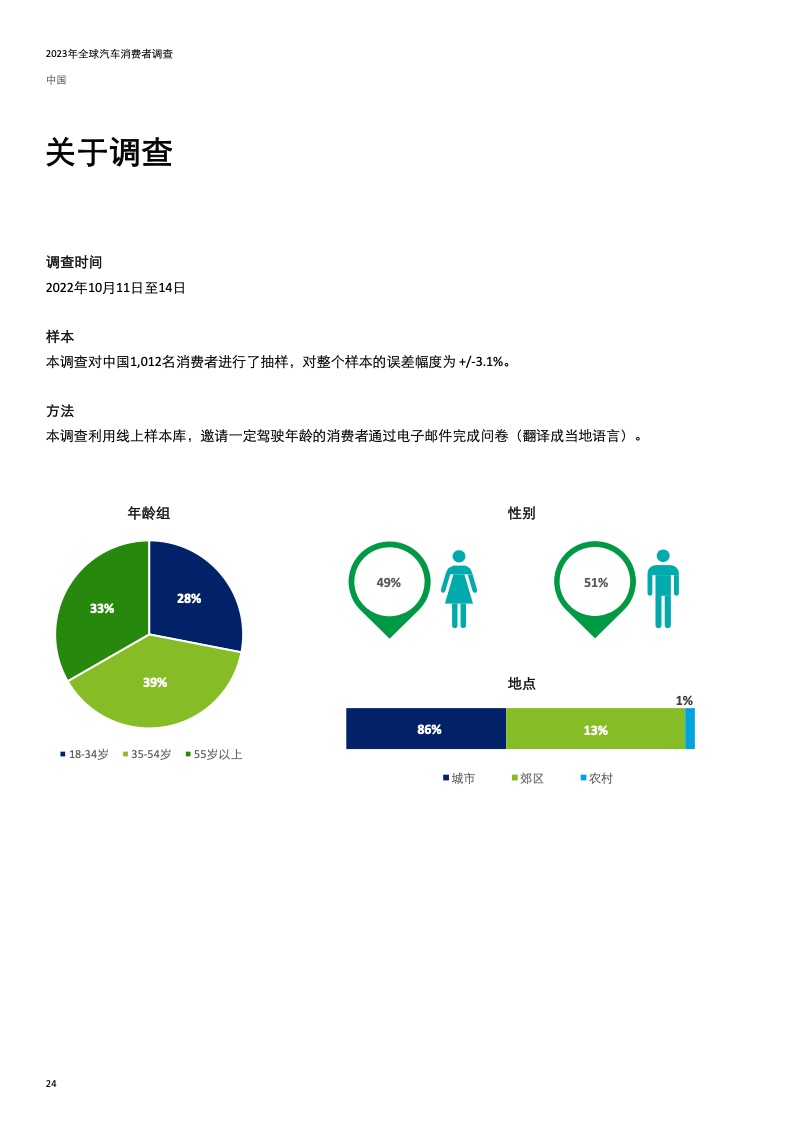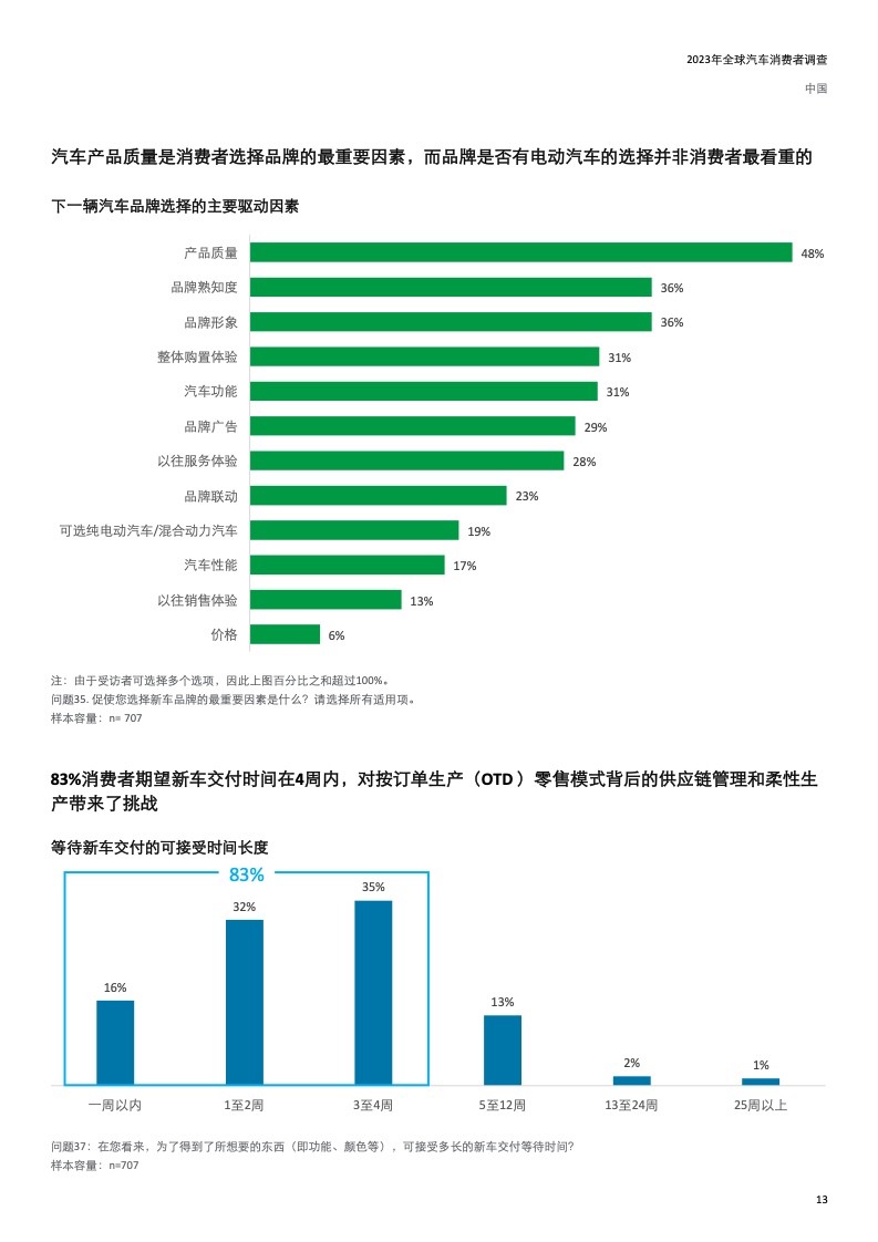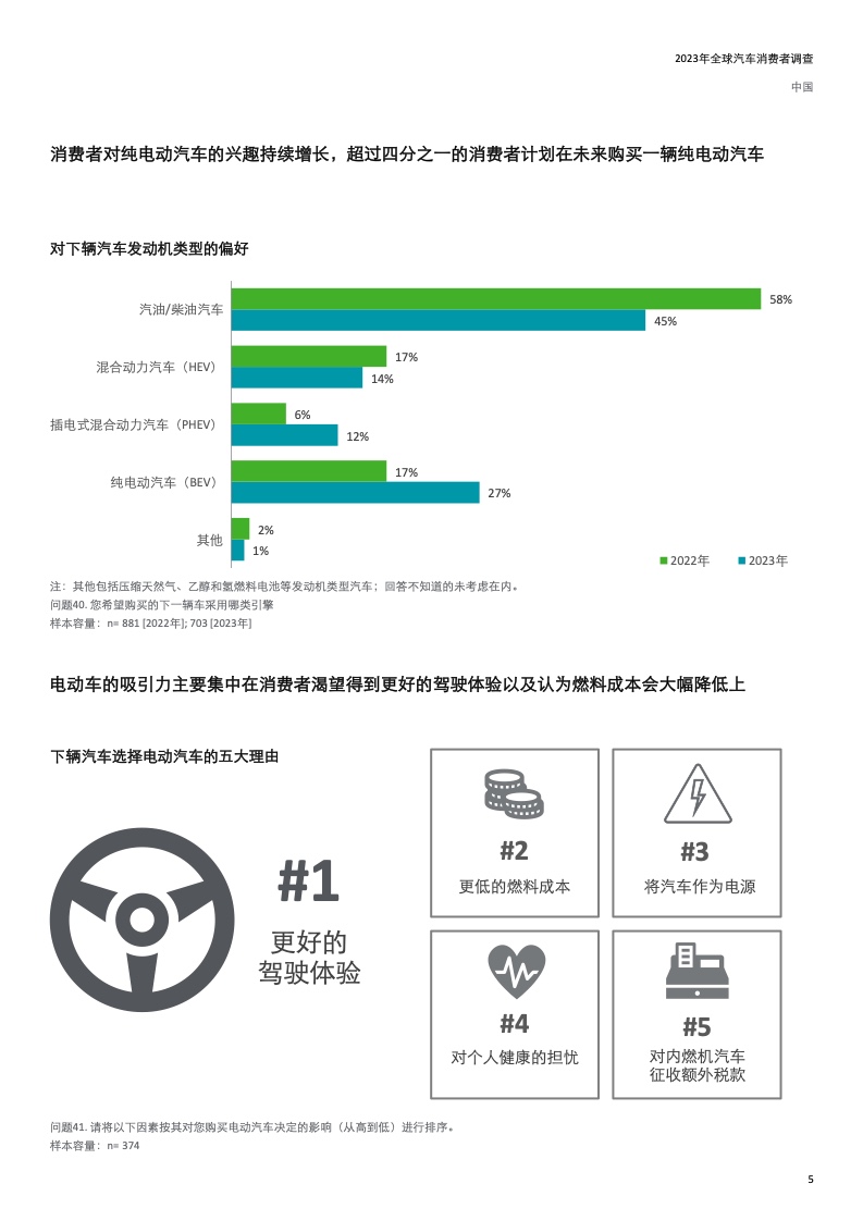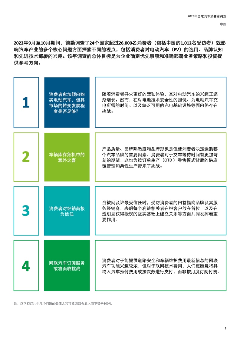 德勤已連續(xù)13年持續(xù)探索影響汽車行業(yè)發(fā)展的汽車消費(fèi)者趨勢(shì)。今年發(fā)布的“2023年全球汽車消費(fèi)者調(diào)查”報(bào)告探討了影響汽車行業(yè)發(fā)展的若干因素,包括消費(fèi)者對(duì)電動(dòng)汽車(EV)的購(gòu)買興趣、品牌偏好、購(gòu)買渠道、車聯(lián)網(wǎng)技術(shù)和消費(fèi)者信任等。本報(bào)告的調(diào)查樣本為德勤在2022年9月至10月期間調(diào)查的來(lái)自24個(gè)國(guó)家的逾26,000名消費(fèi)者。? 通過(guò)本次年度調(diào)查,我們發(fā)現(xiàn):中國(guó)消費(fèi)者對(duì)純電動(dòng)汽車的興趣持續(xù)增長(zhǎng),電動(dòng)車的吸引力主要集中在消費(fèi)者渴望得到更好的駕駛體驗(yàn)以及燃料成本的大幅降低,超過(guò)四分之一的消費(fèi)者計(jì)劃在未來(lái)購(gòu)買一輛純電動(dòng)汽車。但電動(dòng)車要實(shí)現(xiàn)更大規(guī)模的普及,還需要克服“電池安全”、“充電時(shí)長(zhǎng)”、“充電便利性”等方面的阻礙。? 報(bào)告指出,中國(guó)汽車消費(fèi)者在購(gòu)車意向、品牌偏好、渠道選擇、售后偏好和用車習(xí)慣等方面呈現(xiàn)出以下六大核心特征: