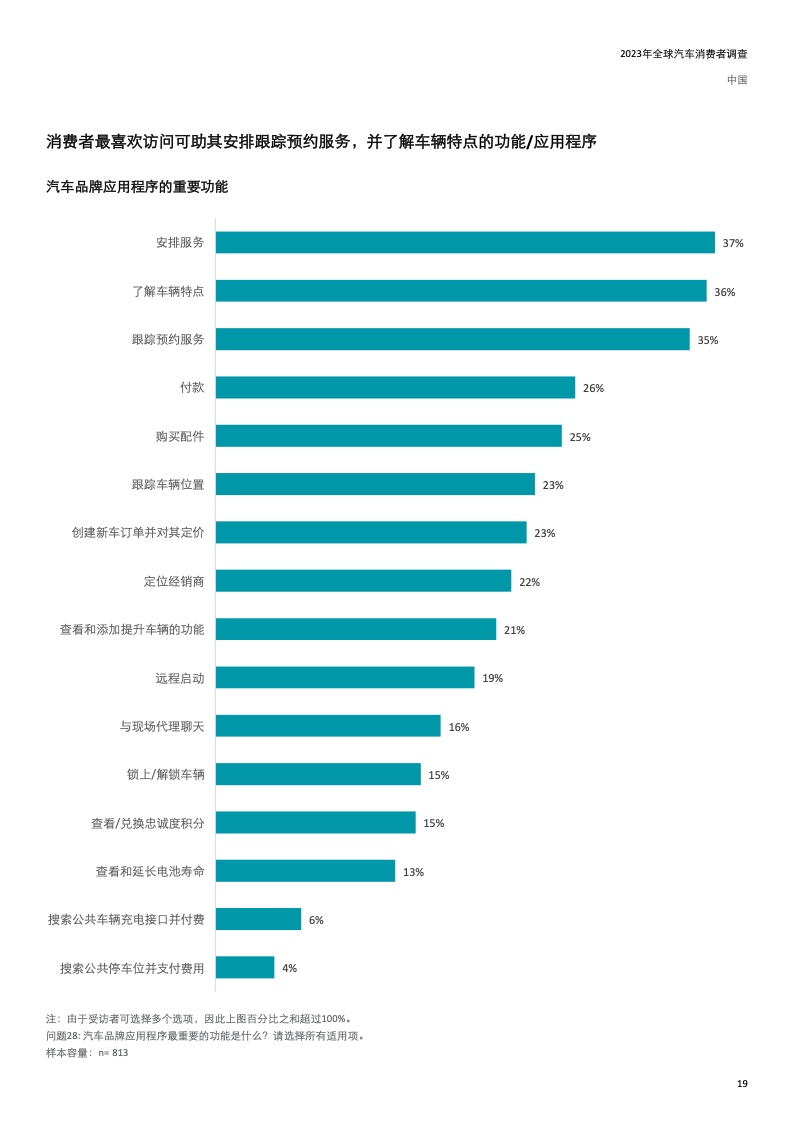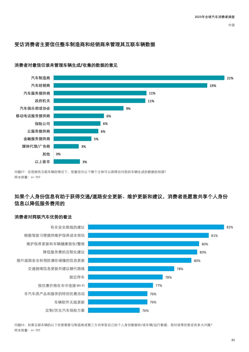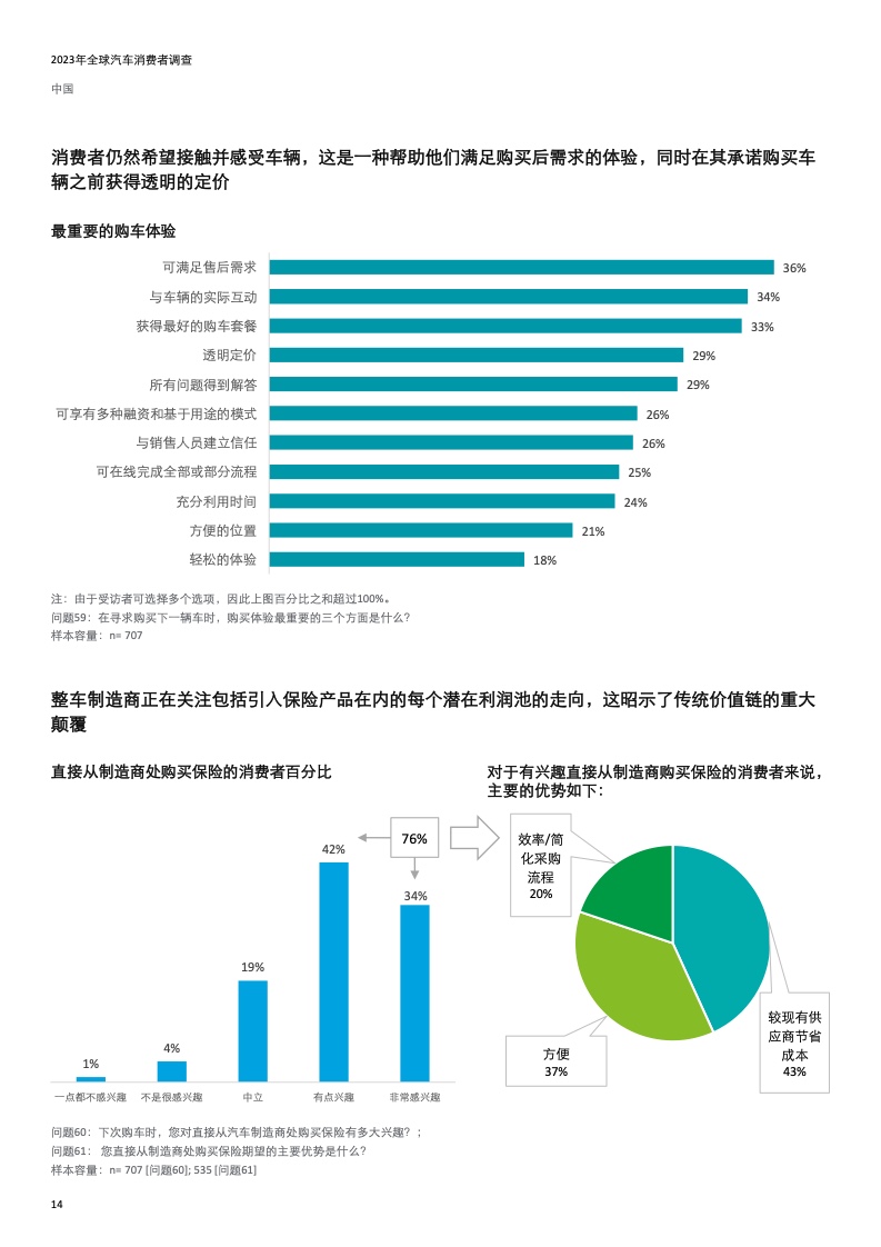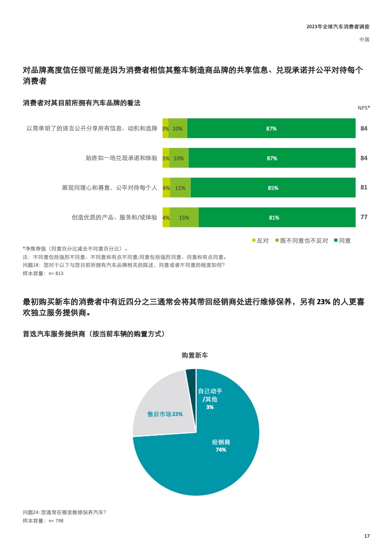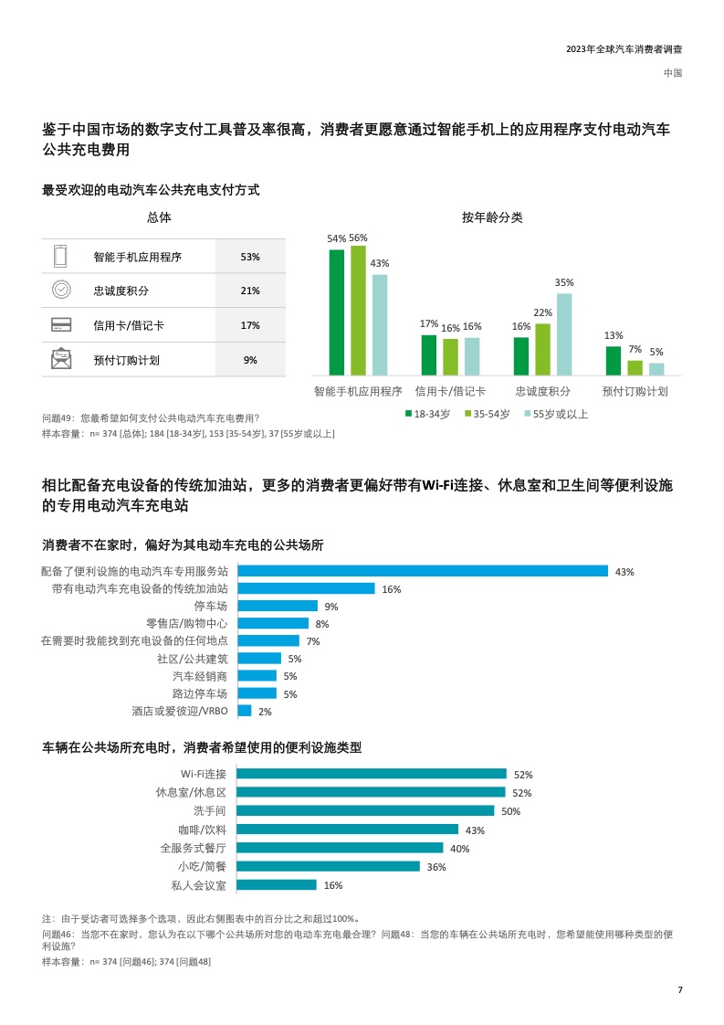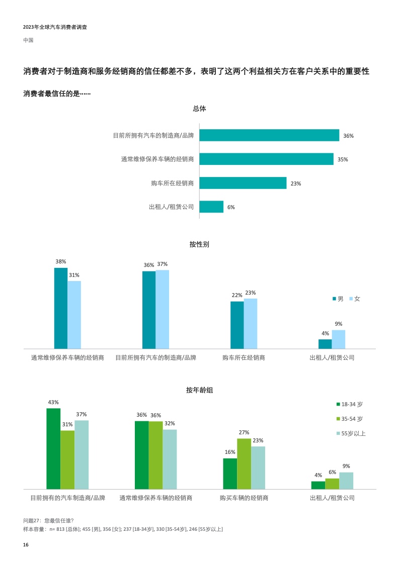 中國(guó)消費(fèi)者對(duì)電動(dòng)汽車的需求呈現(xiàn)剛性 2023年中國(guó)新能源汽車正式進(jìn)入無(wú)補(bǔ)貼時(shí)代,但消費(fèi)者對(duì)新能源汽車的需求有增無(wú)減,對(duì)更好的駕乘體驗(yàn)和更低的使用成本的追求是中國(guó)消費(fèi)者偏好新能源汽車的最底層邏輯。不過(guò)新能源汽車要實(shí)現(xiàn)大規(guī)模普及,搶占對(duì)電動(dòng)車技術(shù)仍持有保守觀念的消費(fèi)群體的心智,車企仍需要在“電池安全”、“充電時(shí)長(zhǎng)”、“充電便利性”等技術(shù)和用戶體驗(yàn)層面下苦功。 傳統(tǒng)企業(yè)品牌光環(huán)褪去,產(chǎn)品質(zhì)量成為消費(fèi)者選擇新車的最主要關(guān)注點(diǎn) 在選擇下一輛汽車品牌時(shí),消費(fèi)者表示更關(guān)心產(chǎn)品質(zhì)量,而非品牌熟知度,表明其更愿意嘗試新興品牌。此外品牌形象(包括企業(yè)傳遞的環(huán)保主義、可持續(xù)發(fā)展等品牌理念)、購(gòu)車體驗(yàn)也是其選擇汽車品牌的關(guān)鍵考慮要素。 售后需求能否被滿足和最優(yōu)惠的購(gòu)車套餐是各銷售渠道在競(jìng)爭(zhēng)中取勝的關(guān)鍵因素 購(gòu)車環(huán)節(jié)中國(guó)消費(fèi)者在定價(jià)透明的基礎(chǔ)上最看重“售后需求能否被滿足”、“試駕體驗(yàn)”和“獲得更好購(gòu)車套餐”。同時(shí)中國(guó)消費(fèi)者對(duì)于交車等待時(shí)間有更加苛刻的期望,這也為“按訂單生產(chǎn)”(OTD)的零售模式背后的供應(yīng)鏈管理和柔性生產(chǎn)帶來(lái)了挑戰(zhàn)。 4S店仍是中國(guó)汽車消費(fèi)者最主流的售后渠道 當(dāng)被問(wèn)及哪個(gè)維修渠道最受信任時(shí),受訪消費(fèi)者的回答指向汽車品牌及其服務(wù)經(jīng)銷商,表明近幾年車企、經(jīng)銷商集團(tuán)在把客戶放在首位,提供更高質(zhì)量的工作服務(wù)、維護(hù)客戶關(guān)系等方面共同發(fā)揮著重要作用。 網(wǎng)聯(lián)技術(shù)需求強(qiáng)勁,但消費(fèi)者對(duì)訂閱付費(fèi)興趣索然,更愿意一次性支付 中國(guó)消費(fèi)者對(duì)于能提供道路安全和車輛維護(hù)費(fèi)用最新信息的網(wǎng)聯(lián)汽車功能興趣較濃,但在付費(fèi)模式上,人們更愿意將其納入汽車預(yù)付費(fèi)用或按次數(shù)進(jìn)行支付,而非按月度訂閱付費(fèi)。 私人充電樁普及面臨政策和成本約束,公共樁繼續(xù)改善體驗(yàn)和便利性 私人/家庭充電樁已成為中國(guó)電動(dòng)汽車用戶的首選充電地點(diǎn)。但在人口密集的城市環(huán)境中安裝家用充電設(shè)備面臨可行性、政策和成本的多重阻礙。支付便利是消費(fèi)者選擇公共充電設(shè)施的重要因素,而且消費(fèi)者對(duì)于充電時(shí)長(zhǎng)擁有較高耐心,這也為充電服務(wù)運(yùn)營(yíng)商挖掘更多消費(fèi)場(chǎng)景提供廣闊機(jī)遇。 ![]() ![]() ![]() ![]() ![]() ![]() ![]() ![]() ![]() ![]() ![]() ![]() ![]() ![]() ![]() ![]() ![]() ![]() ![]() ![]() ![]() ![]() ![]() ![]() ![]() ![]() ![]() ![]() ┃ 免責(zé)聲明:本文版權(quán)歸原發(fā)布機(jī)構(gòu)及作者,如涉及侵權(quán)請(qǐng)聯(lián)系刪除。本文僅供參考,如需使用相關(guān)信息請(qǐng)參閱報(bào)告原文。 ┃ 獲取PDF完整版報(bào)告下載方式請(qǐng)關(guān)注:報(bào)告派 |