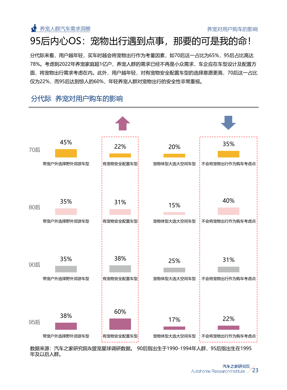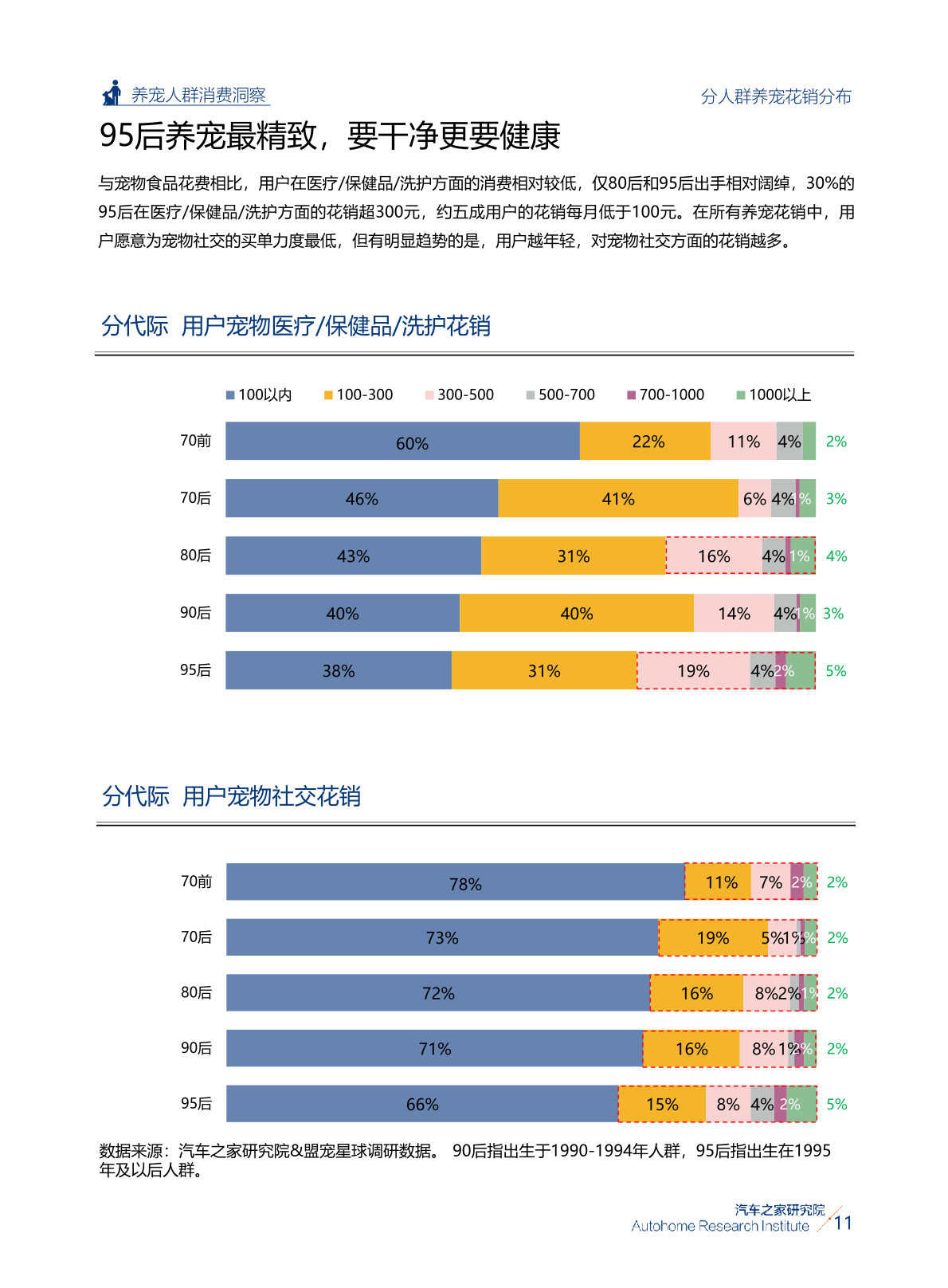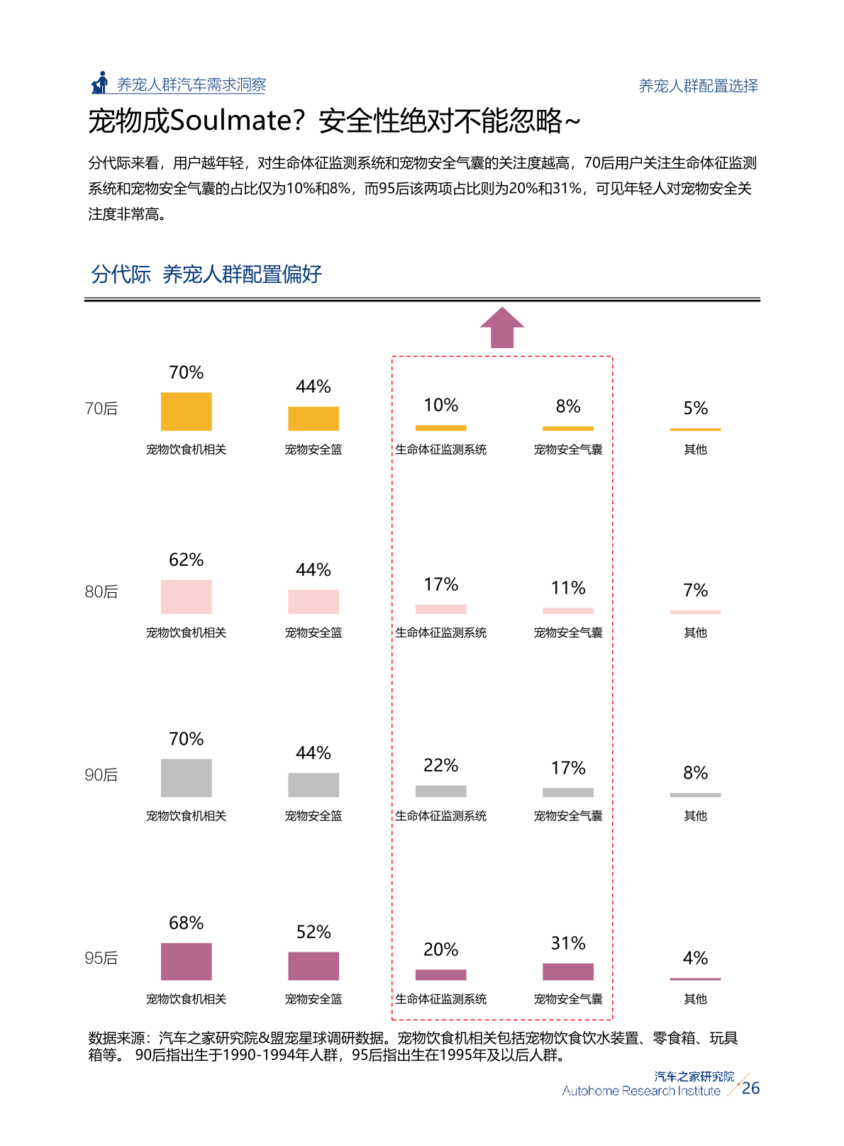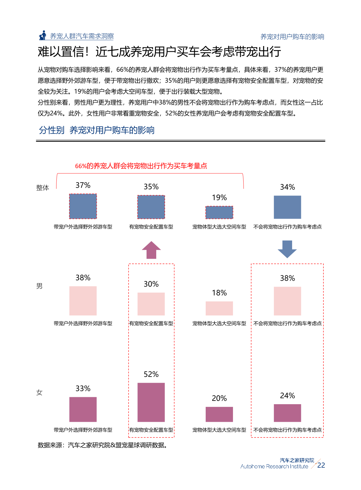 報告從養(yǎng)寵人群偏好洞察、養(yǎng)寵人群消費(fèi)洞察以及養(yǎng)寵人汽車需求洞察三方面,分析養(yǎng)寵人的消費(fèi)理念及汽車相關(guān)需求。 養(yǎng)寵人群偏好方面,根據(jù)調(diào)研數(shù)據(jù)顯示,用戶年紀(jì)越大越喜歡養(yǎng)狗,64%的70前更喜歡養(yǎng)狗,而用戶越年輕則更喜歡養(yǎng)貓,八成95后更愿意養(yǎng)貓。 分品牌來看,超豪華品牌用戶更喜歡養(yǎng)寵物,他們有錢有閑,養(yǎng)貓用戶占比為69%,養(yǎng)狗用戶占比為54%。中國傳統(tǒng)品牌用戶更喜歡養(yǎng)狗,養(yǎng)狗意愿最為強(qiáng)烈,占比為55%。 養(yǎng)寵人群消費(fèi)方面,整體來看,女性在寵物食品以及洗護(hù)醫(yī)療方面的花銷遠(yuǎn)高于男性,女性愛吃愛美愛干凈,這些習(xí)慣同樣體現(xiàn)在養(yǎng)寵上。女性用戶在寵物食品/零食和醫(yī)療/保健品/洗護(hù)方面的花銷每月花費(fèi)超過300元以上占比分別為66%和27%,而男性用戶這兩項占比為53%和22%。男性則喜歡玩,給寵物買玩具更為強(qiáng)烈,27%的男士愿意每月為寵物花費(fèi)300元以上用于購買寵物用品,女士這一占比僅為23%。 空閑時間帶寵出行方面,近八成用戶喜歡帶著寵物周邊游玩,日常溜公園、爬山、野游是多數(shù)人的首選。兩成以上用戶喜歡旅游帶寵物,畢竟平時陪寵物時間有限,有條件自駕出游,帶寵出行也是個不錯的選擇。用戶整體對寵物營地、寵物運(yùn)動會以及寵物游泳派對等新興活動參與度低。 分性別來看,男性養(yǎng)寵側(cè)重于玩,喜歡帶寵物周邊玩或者旅游,占比分別為82%和26%。女性用戶則更傾向參加寵物展,在寵物展上不僅可以見到更多可愛的貓貓狗狗,同時也可以溝通交流好用好玩的寵物用品和養(yǎng)寵心得。 養(yǎng)寵人汽車需求方面,66%的養(yǎng)寵人群會將寵物出行作為買車考量點(diǎn),37%的養(yǎng)寵用戶更愿意選擇野外郊游車型,便于帶寵物出行撒歡;35%的用戶則更愿意選擇有寵物安全配置車型,對寵物的安全非常關(guān)注。19%的用戶會考慮大空間車型,便于出行裝載大型寵物。 分性別來看,男性用戶更為理性,但仍舊有62%的養(yǎng)寵男性將寵物出行作為購車考慮點(diǎn),女性這一占比則為驚人的76%。此外,女性用戶非??粗貙櫸锍鲂邪踩?,52%的女性養(yǎng)寵用戶還會考慮有寵物安全配置車型。 寵物與車型選擇來看,用戶整體對寵物飲食機(jī)相關(guān)配置關(guān)注度最高,占比為67%。與男性相比,女性更加細(xì)膩,對寵物感受和體驗更為敏感,要求更高,故而對寵物出行的安全性更加關(guān)注,更希望出行車輛能配備寵物安全籃和安全氣囊,這兩項占比分別是60%和33%,遠(yuǎn)高于男性的40%和11%。 ┃ 免責(zé)聲明:本文版權(quán)歸原發(fā)布機(jī)構(gòu)及作者,如涉及侵權(quán)請聯(lián)系刪除。本文僅供參考,如需使用相關(guān)信息請參閱報告原文。 ┃ 獲取PDF完整版報告下載方式請關(guān)注:報告派 |