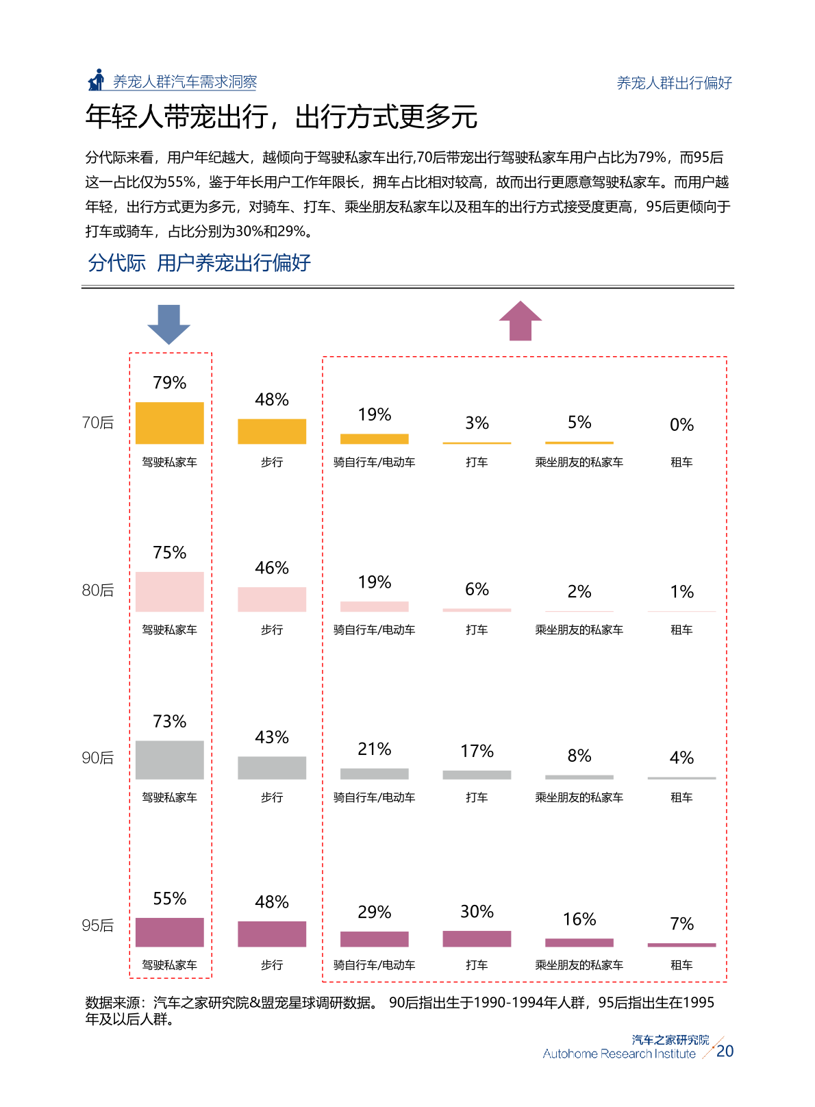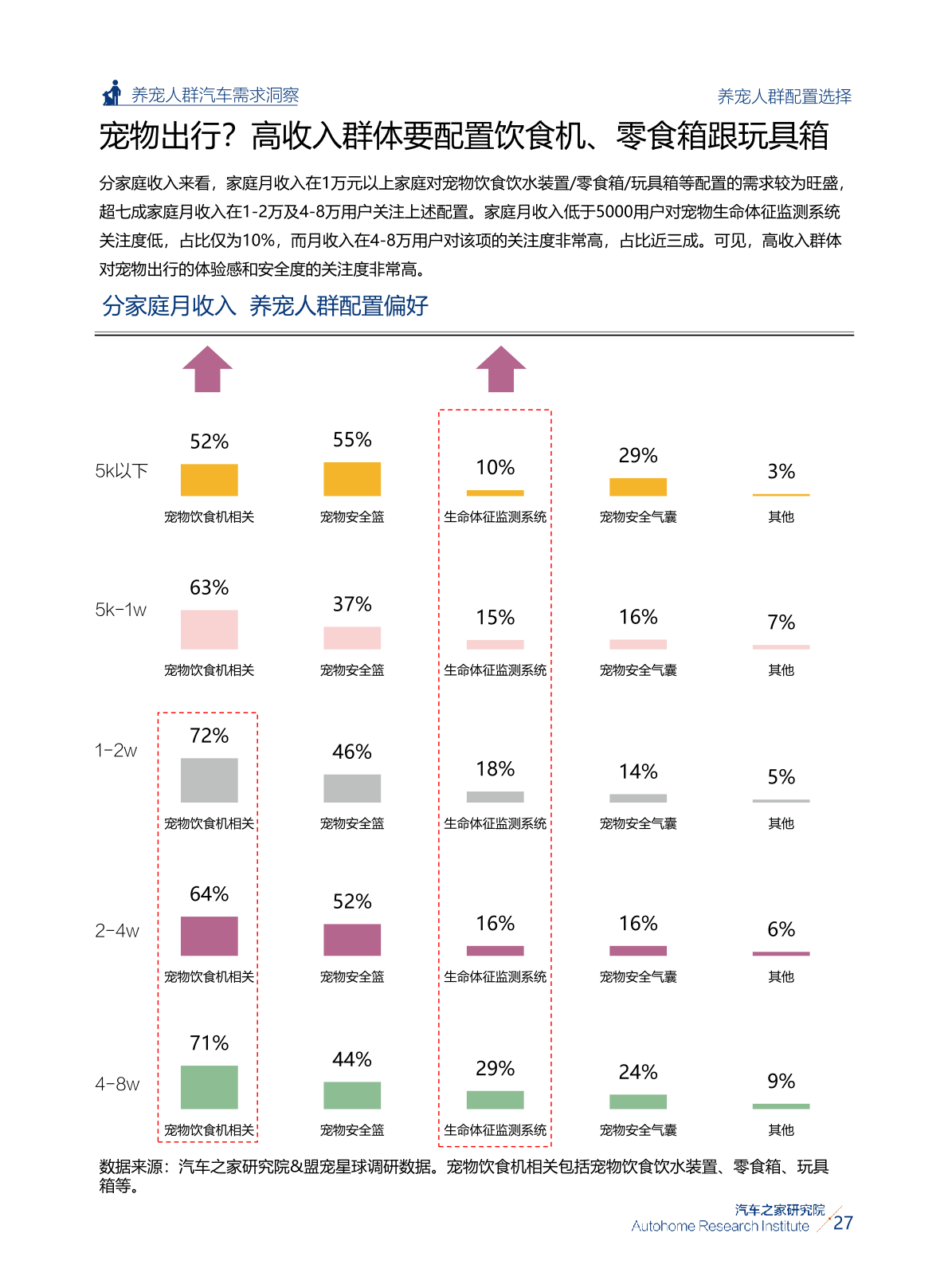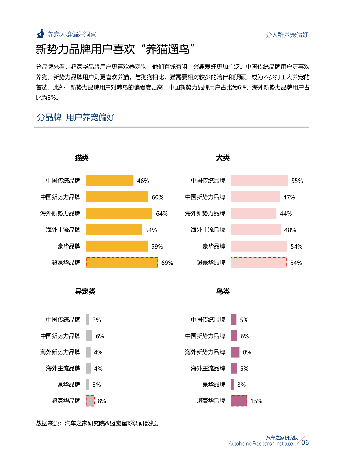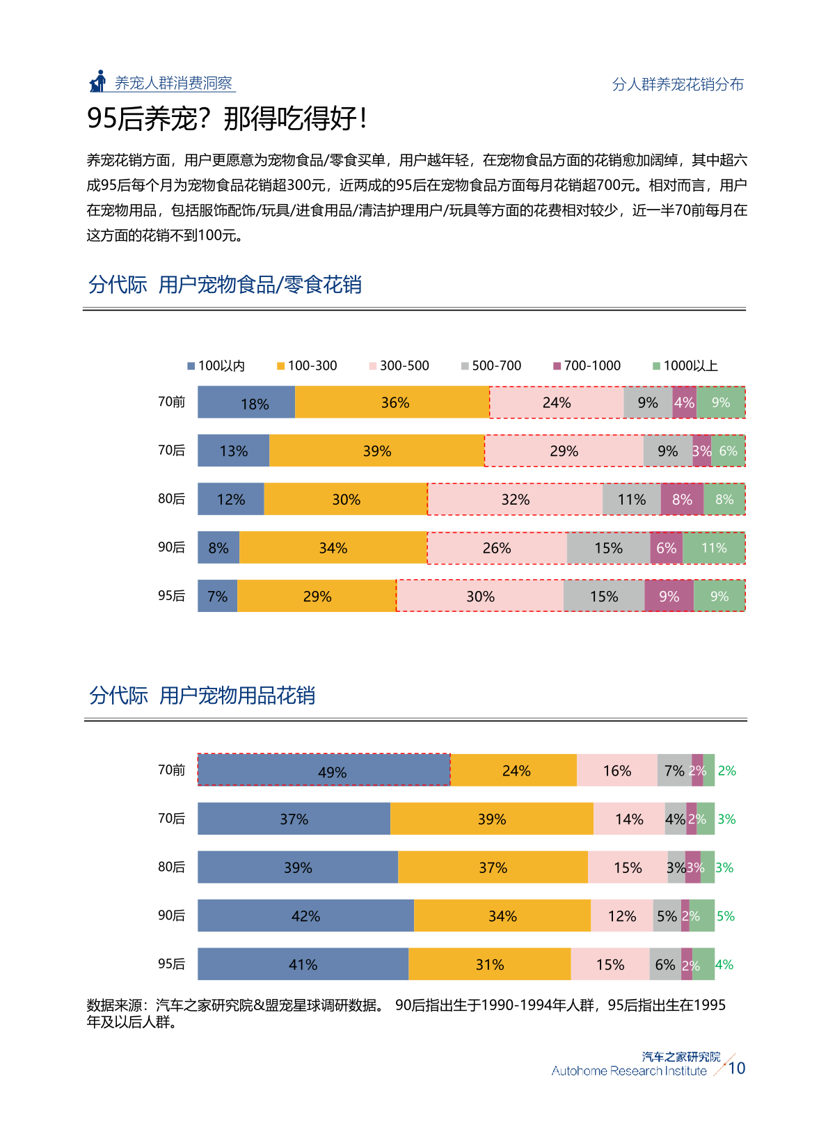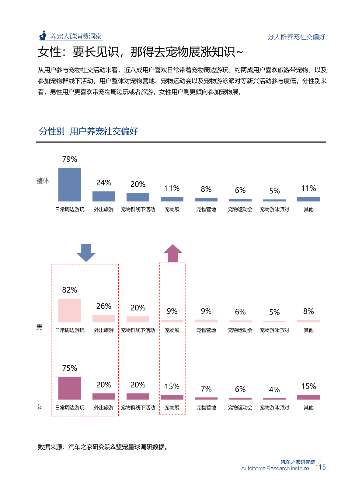 報告從養(yǎng)寵人群偏好洞察、養(yǎng)寵人群消費(fèi)洞察以及養(yǎng)寵人汽車需求洞察三方面,分析養(yǎng)寵人的消費(fèi)理念及汽車相關(guān)需求。 養(yǎng)寵人群偏好方面,根據(jù)調(diào)研數(shù)據(jù)顯示,用戶年紀(jì)越大越喜歡養(yǎng)狗,64%的70前更喜歡養(yǎng)狗,而用戶越年輕則更喜歡養(yǎng)貓,八成95后更愿意養(yǎng)貓。 分品牌來看,超豪華品牌用戶更喜歡養(yǎng)寵物,他們有錢有閑,養(yǎng)貓用戶占比為69%,養(yǎng)狗用戶占比為54%。中國傳統(tǒng)品牌用戶更喜歡養(yǎng)狗,養(yǎng)狗意愿最為強(qiáng)烈,占比為55%。 養(yǎng)寵人群消費(fèi)方面,整體來看,女性在寵物食品以及洗護(hù)醫(yī)療方面的花銷遠(yuǎn)高于男性,女性愛吃愛美愛干凈,這些習(xí)慣同樣體現(xiàn)在養(yǎng)寵上。女性用戶在寵物食品/零食和醫(yī)療/保健品/洗護(hù)方面的花銷每月花費(fèi)超過300元以上占比分別為66%和27%,而男性用戶這兩項占比為53%和22%。男性則喜歡玩,給寵物買玩具更為強(qiáng)烈,27%的男士愿意每月為寵物花費(fèi)300元以上用于購買寵物用品,女士這一占比僅為23%。 空閑時間帶寵出行方面,近八成用戶喜歡帶著寵物周邊游玩,日常溜公園、爬山、野游是多數(shù)人的首選。兩成以上用戶喜歡旅游帶寵物,畢竟平時陪寵物時間有限,有條件自駕出游,帶寵出行也是個不錯的選擇。用戶整體對寵物營地、寵物運(yùn)動會以及寵物游泳派對等新興活動參與度低。 分性別來看,男性養(yǎng)寵側(cè)重于玩,喜歡帶寵物周邊玩或者旅游,占比分別為82%和26%。女性用戶則更傾向參加寵物展,在寵物展上不僅可以見到更多可愛的貓貓狗狗,同時也可以溝通交流好用好玩的寵物用品和養(yǎng)寵心得。 養(yǎng)寵人汽車需求方面,66%的養(yǎng)寵人群會將寵物出行作為買車考量點(diǎn),37%的養(yǎng)寵用戶更愿意選擇野外郊游車型,便于帶寵物出行撒歡;35%的用戶則更愿意選擇有寵物安全配置車型,對寵物的安全非常關(guān)注。19%的用戶會考慮大空間車型,便于出行裝載大型寵物。 分性別來看,男性用戶更為理性,但仍舊有62%的養(yǎng)寵男性將寵物出行作為購車考慮點(diǎn),女性這一占比則為驚人的76%。此外,女性用戶非??粗貙櫸锍鲂邪踩?,52%的女性養(yǎng)寵用戶還會考慮有寵物安全配置車型。 寵物與車型選擇來看,用戶整體對寵物飲食機(jī)相關(guān)配置關(guān)注度最高,占比為67%。與男性相比,女性更加細(xì)膩,對寵物感受和體驗更為敏感,要求更高,故而對寵物出行的安全性更加關(guān)注,更希望出行車輛能配備寵物安全籃和安全氣囊,這兩項占比分別是60%和33%,遠(yuǎn)高于男性的40%和11%。 ┃ 免責(zé)聲明:本文版權(quán)歸原發(fā)布機(jī)構(gòu)及作者,如涉及侵權(quán)請聯(lián)系刪除。本文僅供參考,如需使用相關(guān)信息請參閱報告原文。 ┃ 獲取PDF完整版報告下載方式請關(guān)注:報告派 |