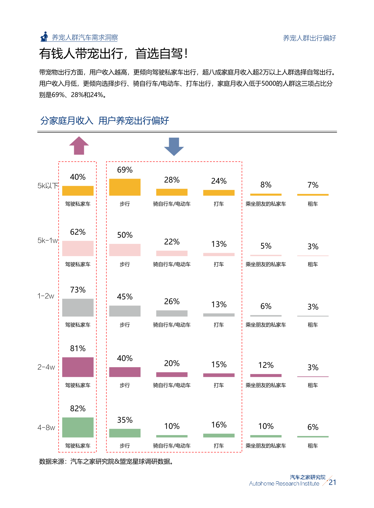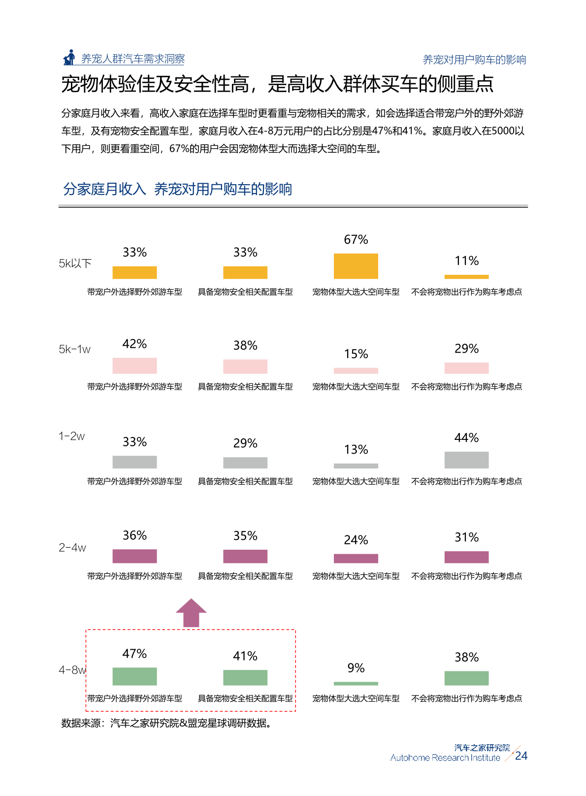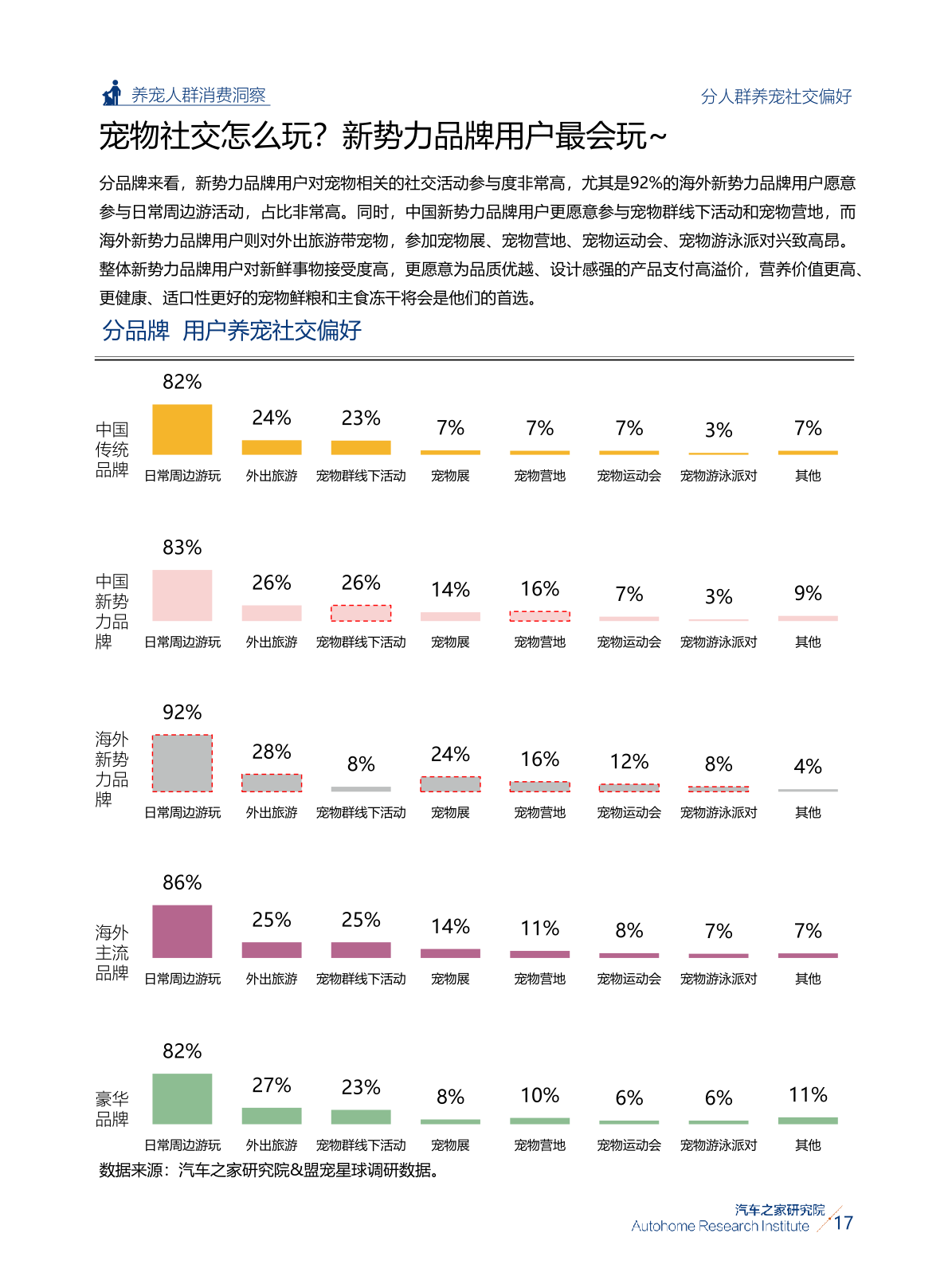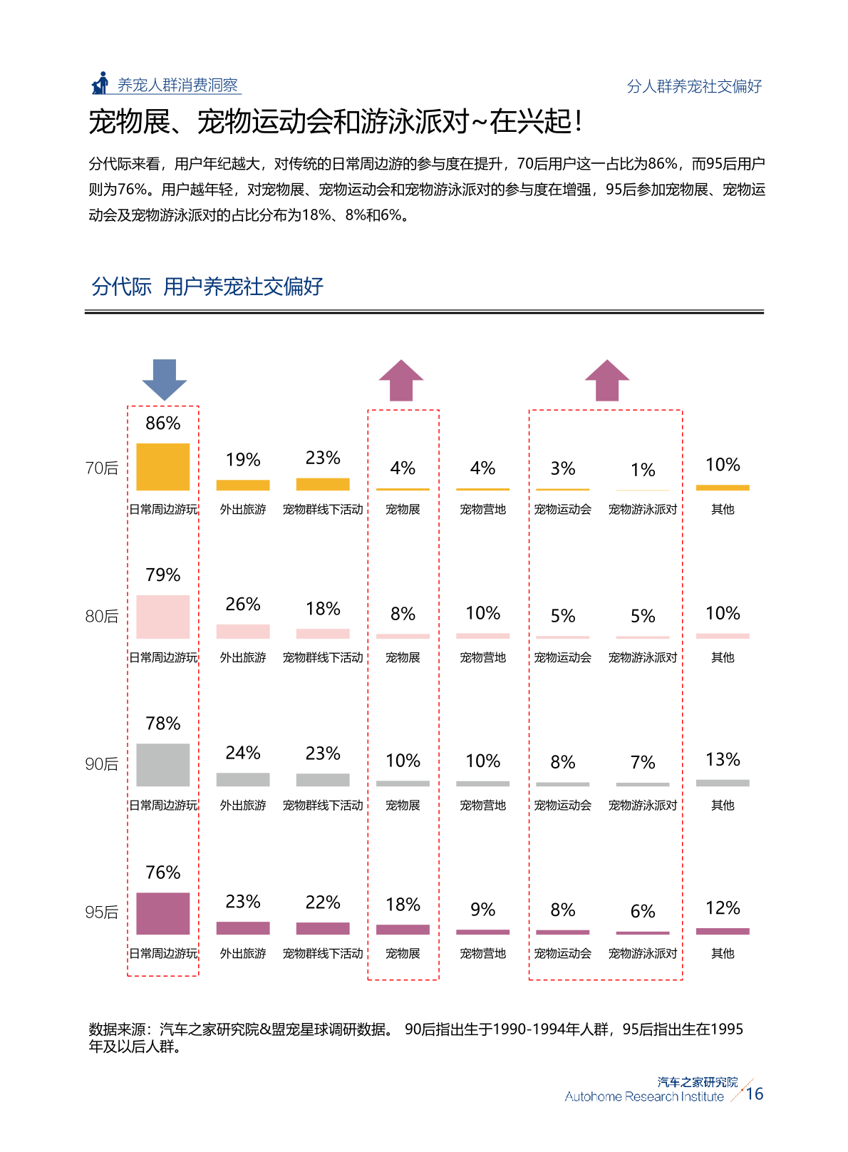 報告從養(yǎng)寵人群偏好洞察、養(yǎng)寵人群消費(fèi)洞察以及養(yǎng)寵人汽車需求洞察三方面,分析養(yǎng)寵人的消費(fèi)理念及汽車相關(guān)需求。 養(yǎng)寵人群偏好方面,根據(jù)調(diào)研數(shù)據(jù)顯示,用戶年紀(jì)越大越喜歡養(yǎng)狗,64%的70前更喜歡養(yǎng)狗,而用戶越年輕則更喜歡養(yǎng)貓,八成95后更愿意養(yǎng)貓。 分品牌來看,超豪華品牌用戶更喜歡養(yǎng)寵物,他們有錢有閑,養(yǎng)貓用戶占比為69%,養(yǎng)狗用戶占比為54%。中國傳統(tǒng)品牌用戶更喜歡養(yǎng)狗,養(yǎng)狗意愿最為強(qiáng)烈,占比為55%。 養(yǎng)寵人群消費(fèi)方面,整體來看,女性在寵物食品以及洗護(hù)醫(yī)療方面的花銷遠(yuǎn)高于男性,女性愛吃愛美愛干凈,這些習(xí)慣同樣體現(xiàn)在養(yǎng)寵上。女性用戶在寵物食品/零食和醫(yī)療/保健品/洗護(hù)方面的花銷每月花費(fèi)超過300元以上占比分別為66%和27%,而男性用戶這兩項占比為53%和22%。男性則喜歡玩,給寵物買玩具更為強(qiáng)烈,27%的男士愿意每月為寵物花費(fèi)300元以上用于購買寵物用品,女士這一占比僅為23%。 空閑時間帶寵出行方面,近八成用戶喜歡帶著寵物周邊游玩,日常溜公園、爬山、野游是多數(shù)人的首選。兩成以上用戶喜歡旅游帶寵物,畢竟平時陪寵物時間有限,有條件自駕出游,帶寵出行也是個不錯的選擇。用戶整體對寵物營地、寵物運(yùn)動會以及寵物游泳派對等新興活動參與度低。 分性別來看,男性養(yǎng)寵側(cè)重于玩,喜歡帶寵物周邊玩或者旅游,占比分別為82%和26%。女性用戶則更傾向參加寵物展,在寵物展上不僅可以見到更多可愛的貓貓狗狗,同時也可以溝通交流好用好玩的寵物用品和養(yǎng)寵心得。 養(yǎng)寵人汽車需求方面,66%的養(yǎng)寵人群會將寵物出行作為買車考量點(diǎn),37%的養(yǎng)寵用戶更愿意選擇野外郊游車型,便于帶寵物出行撒歡;35%的用戶則更愿意選擇有寵物安全配置車型,對寵物的安全非常關(guān)注。19%的用戶會考慮大空間車型,便于出行裝載大型寵物。 分性別來看,男性用戶更為理性,但仍舊有62%的養(yǎng)寵男性將寵物出行作為購車考慮點(diǎn),女性這一占比則為驚人的76%。此外,女性用戶非??粗貙櫸锍鲂邪踩?,52%的女性養(yǎng)寵用戶還會考慮有寵物安全配置車型。 寵物與車型選擇來看,用戶整體對寵物飲食機(jī)相關(guān)配置關(guān)注度最高,占比為67%。與男性相比,女性更加細(xì)膩,對寵物感受和體驗更為敏感,要求更高,故而對寵物出行的安全性更加關(guān)注,更希望出行車輛能配備寵物安全籃和安全氣囊,這兩項占比分別是60%和33%,遠(yuǎn)高于男性的40%和11%。 ┃ 免責(zé)聲明:本文版權(quán)歸原發(fā)布機(jī)構(gòu)及作者,如涉及侵權(quán)請聯(lián)系刪除。本文僅供參考,如需使用相關(guān)信息請參閱報告原文。 ┃ 獲取PDF完整版報告下載方式請關(guān)注:報告派 |