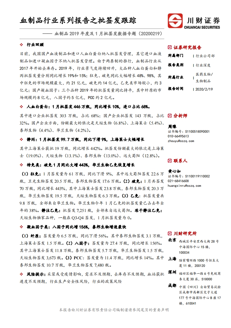 血制品2019年度及1月批簽發(fā)數(shù)據(jù)專題:血制品行業(yè)系列報告之批簽發(fā)跟蹤
