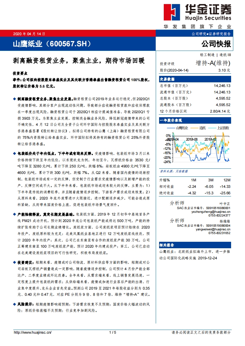 2020-04-15-華金證券-山鷹紙業(yè)-剝離融資租賃業(yè)務(wù),聚焦主業(yè),期待市場回暖