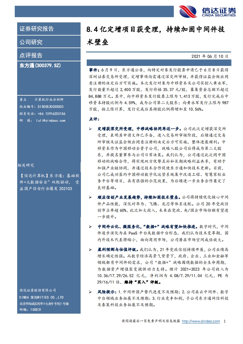 2021-06-10-信達(dá)證券-東方通-8.4億定增項(xiàng)目獲受理,持續(xù)加固中間件技術(shù)壁壘