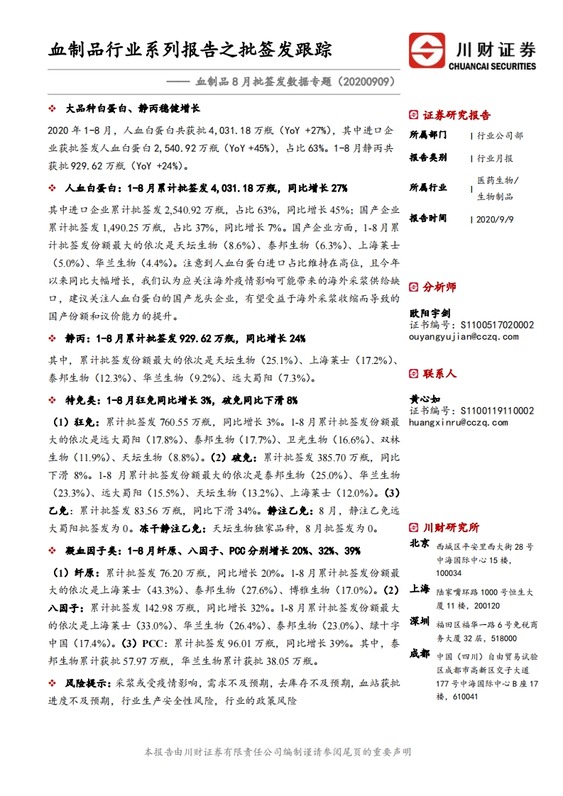 血制品8月批簽發(fā)數(shù)據(jù)專題:血制品行業(yè)系列報(bào)告之批簽發(fā)跟蹤