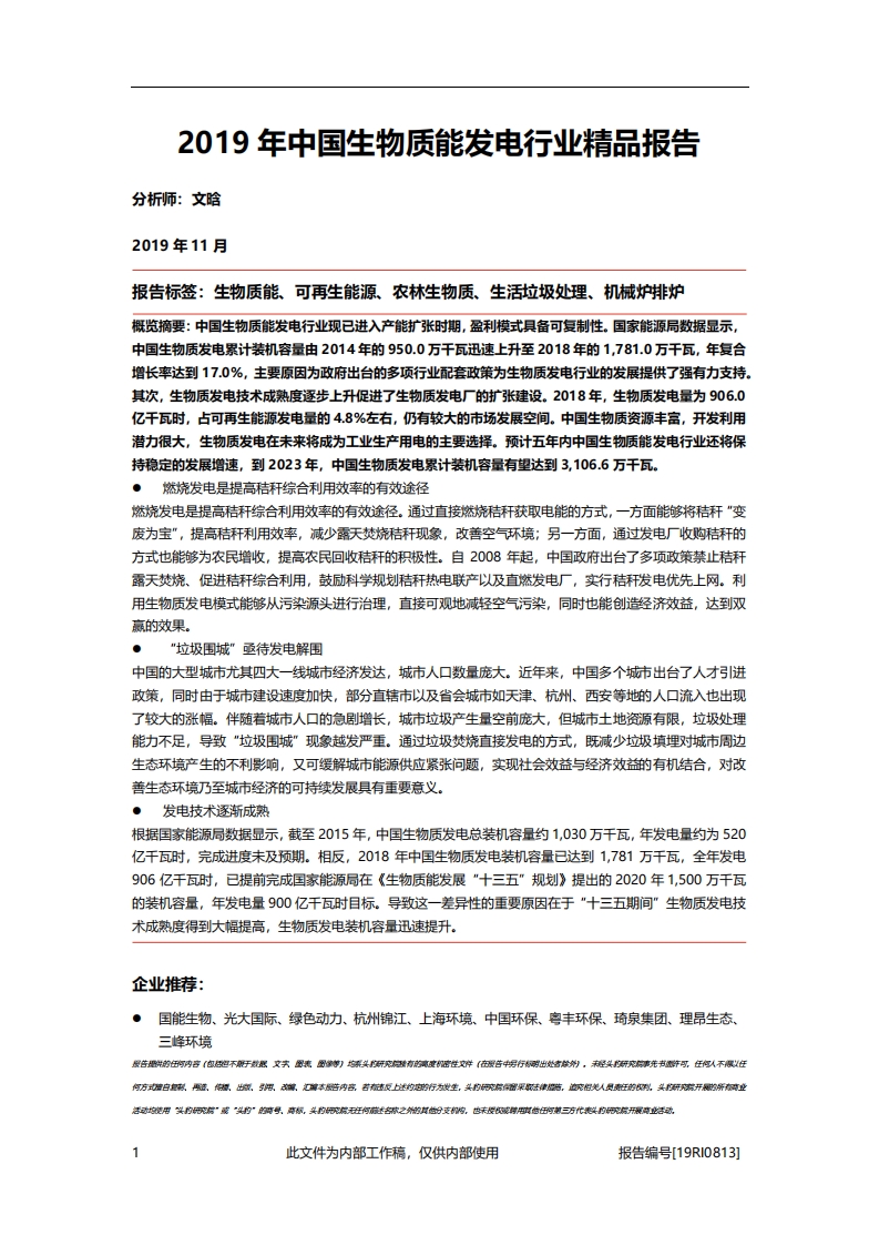 2019年中國生物質(zhì)能發(fā)電行業(yè)精品報(bào)告