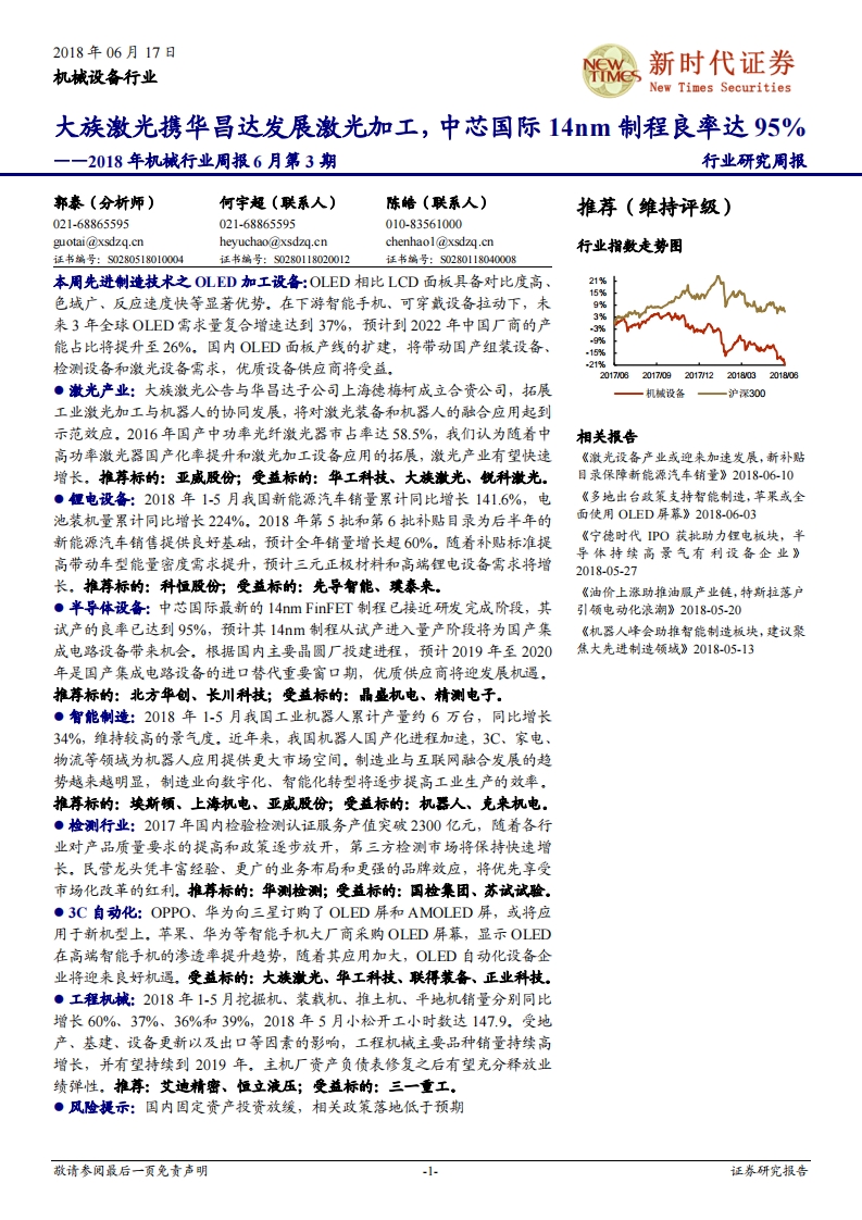 2018年機(jī)械行業(yè)周報(bào)6月第3期:大族激光攜華昌達(dá)發(fā)展激光加工,中芯國(guó)際14nm制程良率達(dá)95%