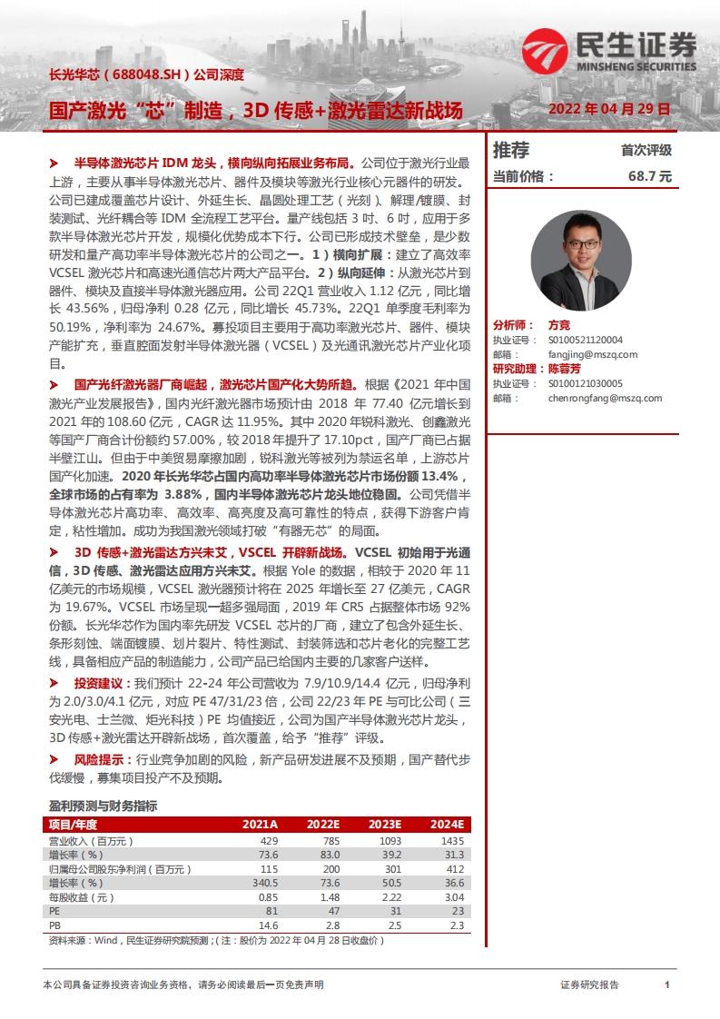 2022-04-30-民生證券-長(zhǎng)光華芯-公司深度:國(guó)產(chǎn)激光“芯”制造,3D傳感+激光雷達(dá)新戰(zhàn)場(chǎng)