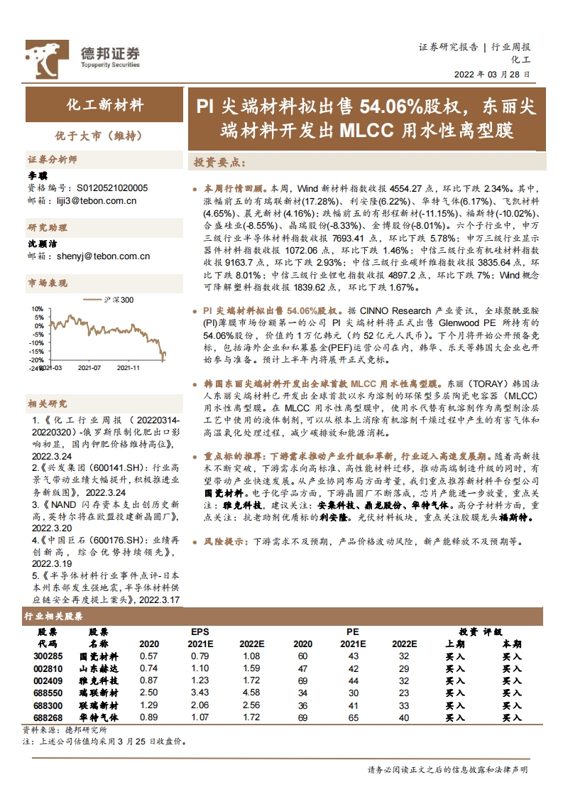 化工新材料行業(yè)周報:PI尖端材料擬出售54.06%股權(quán),東麗尖端材料開發(fā)出MLCC用水性離型膜