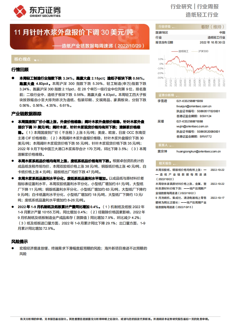 2022-11-01-東方證券--造紙產(chǎn)業(yè)鏈數(shù)據(jù)每周速遞:11月針葉木漿外盤報價下調(diào)30美元-噸