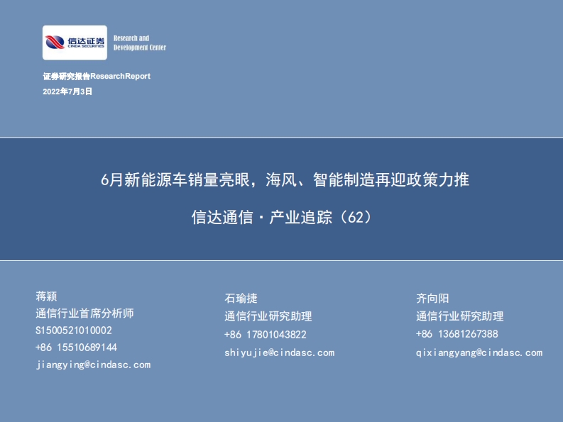 2022-07-03-信達(dá)證券--信達(dá)通信·產(chǎn)業(yè)追蹤(62):6月新能源車銷量亮眼,海風(fēng)、智能制造再迎政策力推
