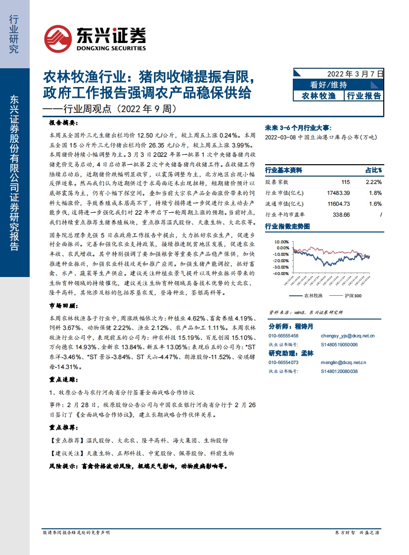 農(nóng)林牧漁行業(yè)周觀點(diǎn)(2022年9周):豬肉收儲(chǔ)提振有限,政府工作報(bào)告強(qiáng)調(diào)農(nóng)產(chǎn)品穩(wěn)保供給