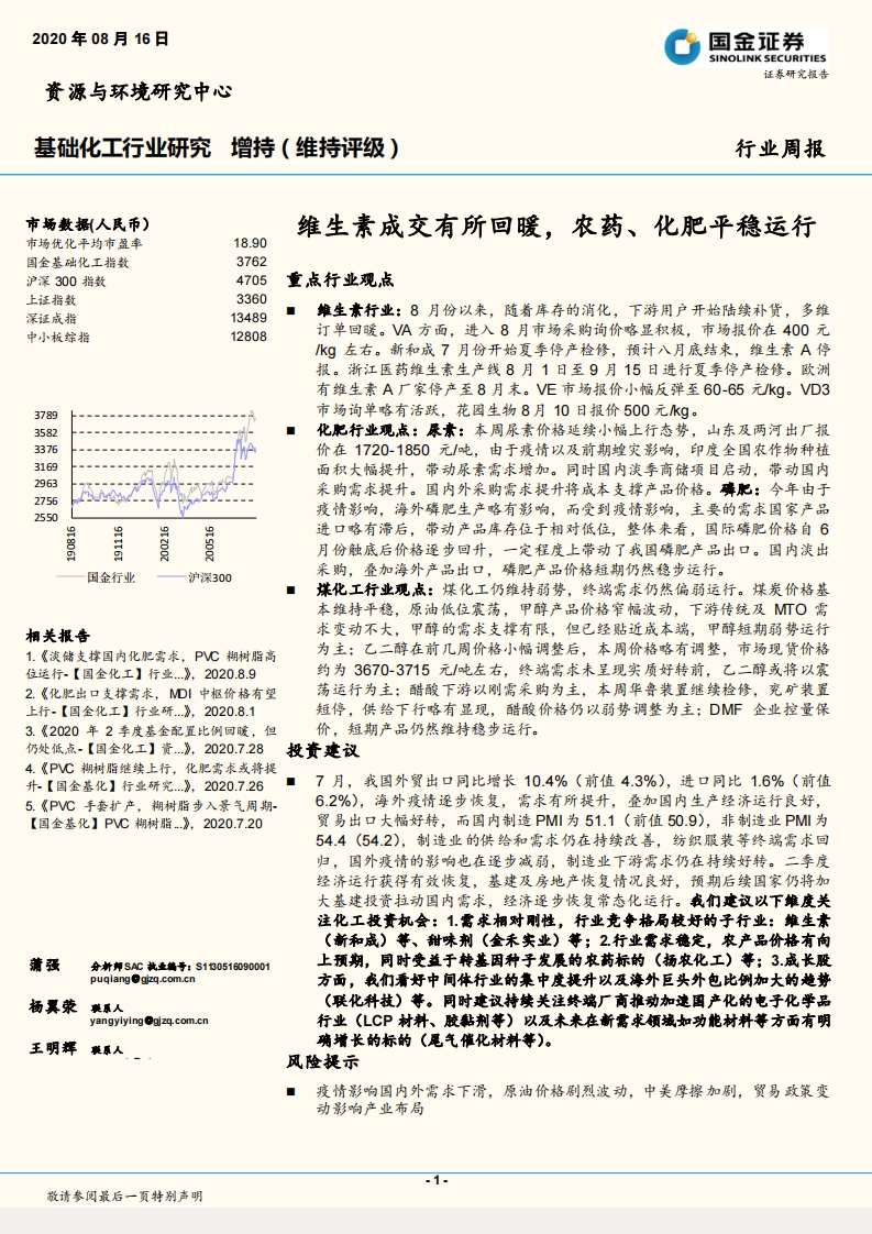 基礎化工行業(yè)研究:維生素成交有所回暖,農藥、化肥平穩(wěn)運行