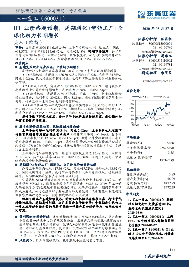2020-08-28-東吳證券-三一重工-H1業(yè)績略超預期,周期弱化+智能工廠+全球化助力長期增長