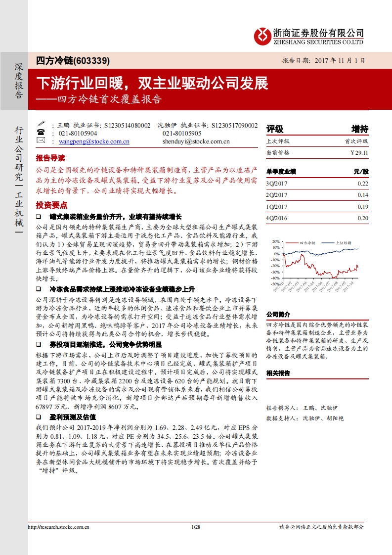 2017-11-03-浙商證券-四方冷鏈-四方冷鏈?zhǔn)状胃采w報(bào)告:下游行業(yè)回暖, 雙主業(yè)驅(qū)動公司發(fā)展