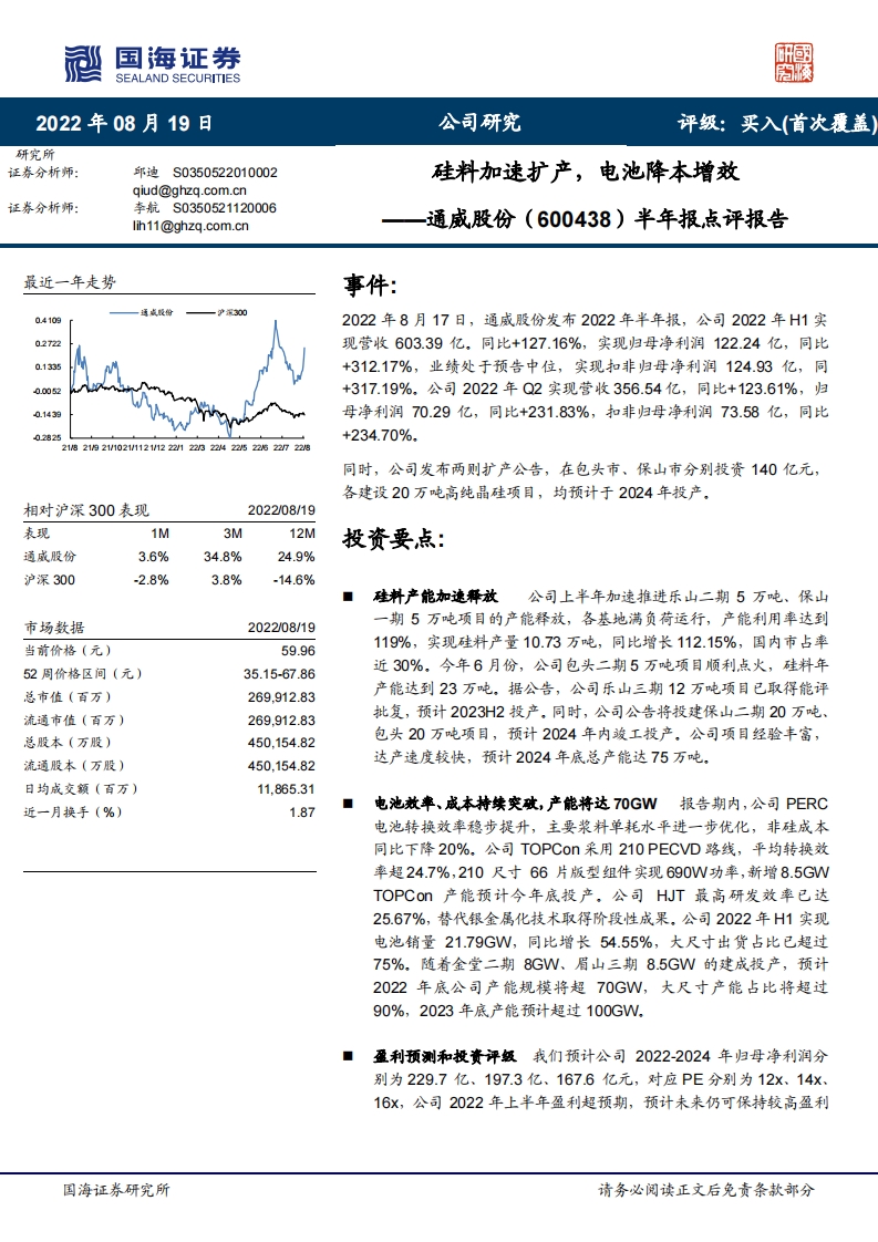 2022-08-21-國(guó)海證券-通威股份-半年報(bào)點(diǎn)評(píng)報(bào)告:硅料加速擴(kuò)產(chǎn),電池降本增效