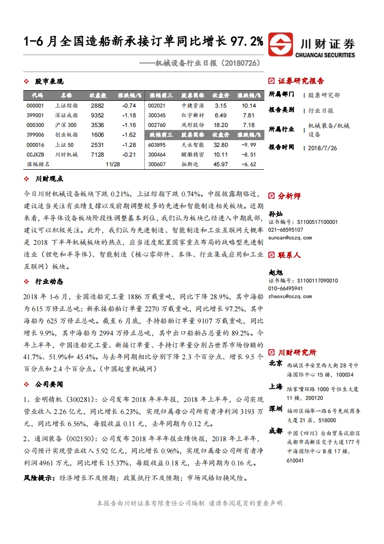 機(jī)械設(shè)備行業(yè)日報:1-6月全國造船新承接訂單同比增長97.2%