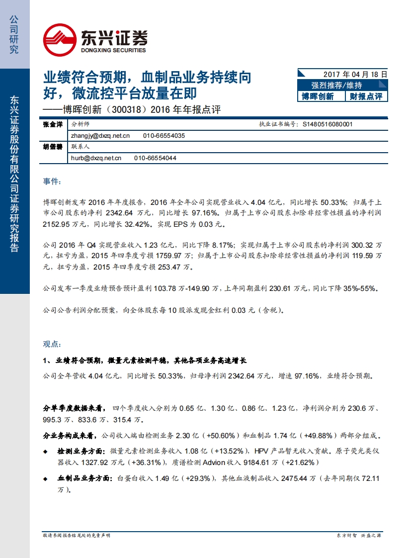 2017-04-19-東興證券-博暉創(chuàng)新-2016年年報點評:業(yè)績符合預期,血制品業(yè)務持續(xù)向好,微流控平臺放量在即