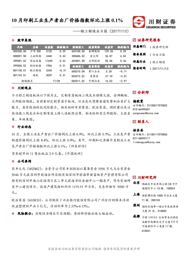 輕工制造業(yè)日?qǐng)?bào):10月印刷工業(yè)生產(chǎn)者出廠價(jià)格指數(shù)環(huán)比上漲0.1%