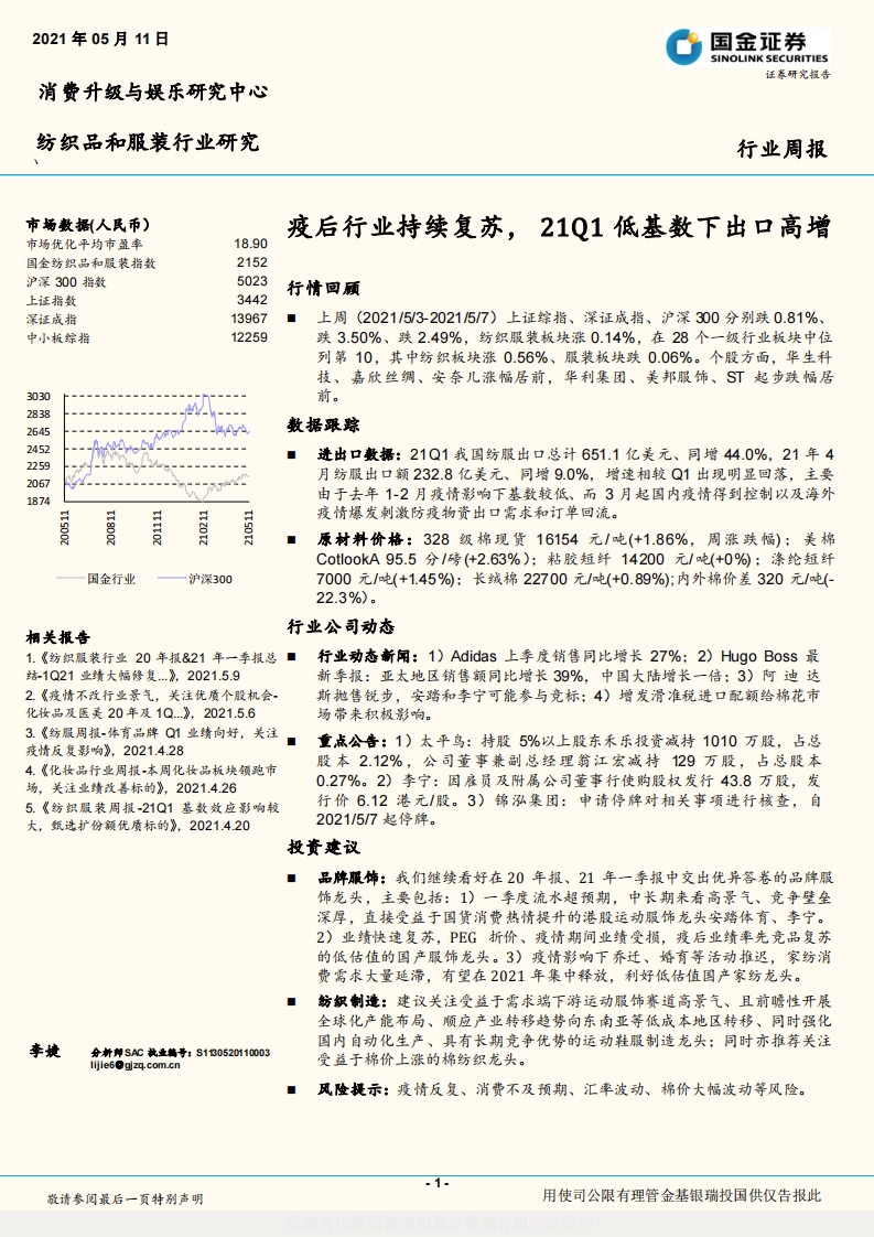 紡織品和服裝行業(yè)研究:疫后行業(yè)持續(xù)復(fù)蘇,21Q1低基數(shù)下出口高增
