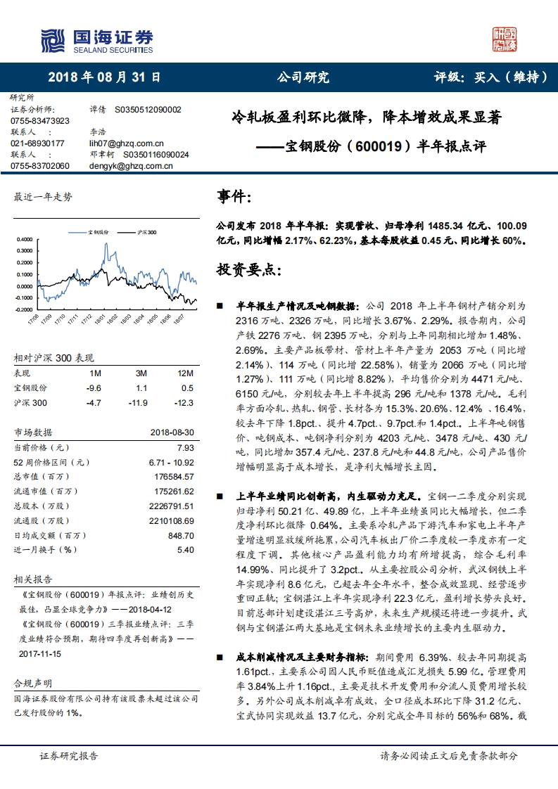 2018-08-31-國海證券-寶鋼股份-半年報點評:冷軋板盈利環(huán)比微降,降本增效成果顯著