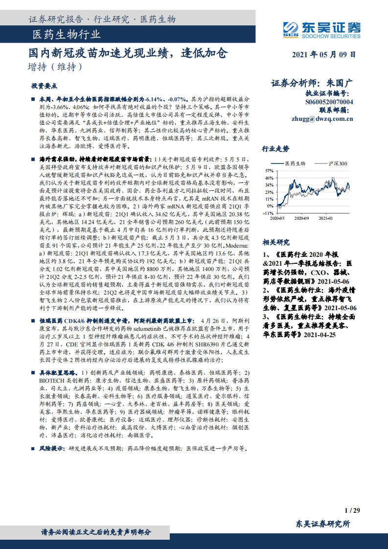 醫(yī)藥生物行業(yè):國內(nèi)新冠疫苗加速兌現(xiàn)業(yè)績,逢低加倉