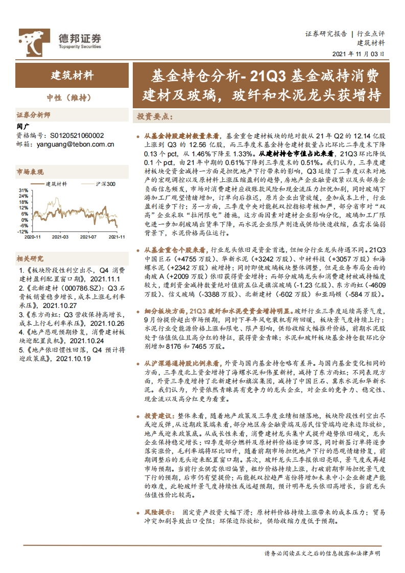 建筑材料:基金持倉分析-21Q3基金減持消費建材及玻璃,玻纖和水泥龍頭獲增持