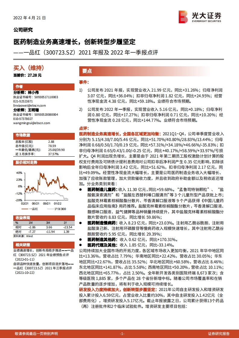 2022-04-22-光大證券-一品紅-2021年報及2022年一季報點評:醫(yī)藥制造業(yè)務高速增長,創(chuàng)新轉(zhuǎn)型步履堅定