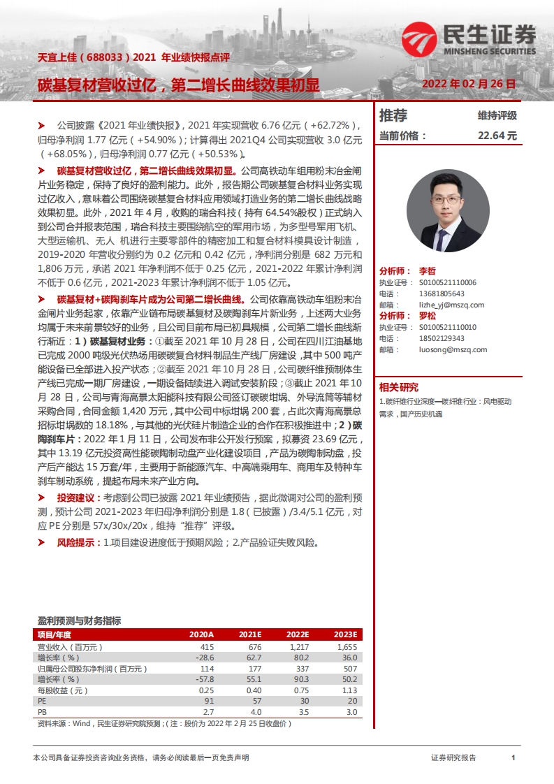 2022-02-28-民生證券-天宜上佳-2021年業(yè)績快報(bào)點(diǎn)評:碳基復(fù)材營收過億,第二增長曲線效果初顯