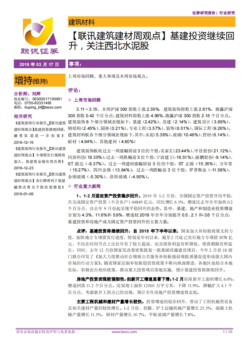 【聯(lián)訊建筑建材周觀點(diǎn)】基建投資繼續(xù)回升,關(guān)注西北水泥股