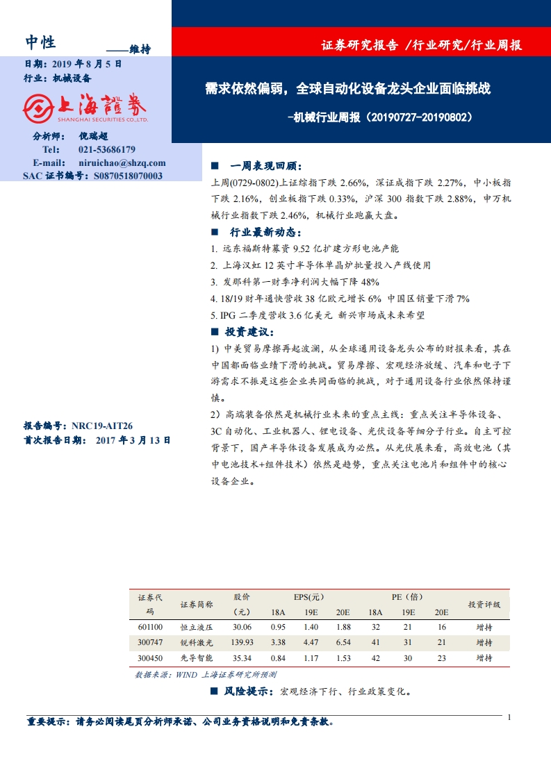 機(jī)械行業(yè)周報(bào):需求依然偏弱,全球自動(dòng)化設(shè)備龍頭企業(yè)面臨挑戰(zhàn)