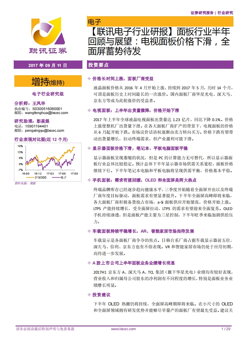 【聯(lián)訊電子行業(yè)研報】面板行業(yè)半年回顧與展望:電視面板價格下滑,全面屏蓄勢待發(fā)