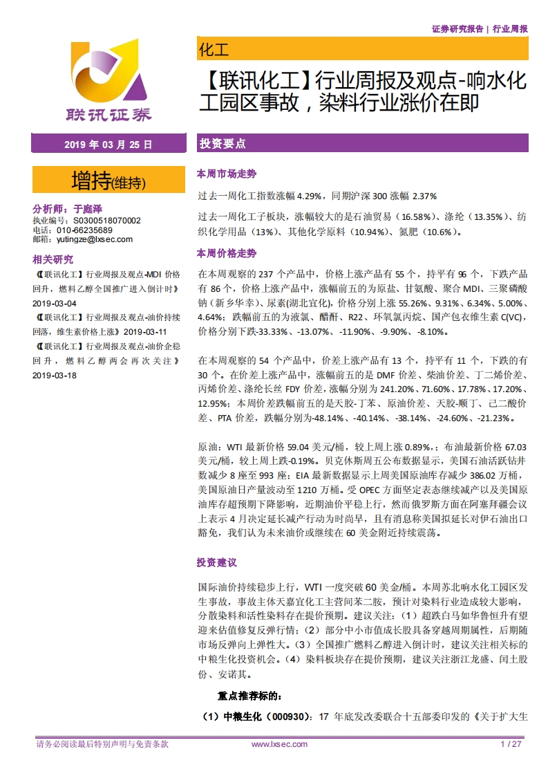 【聯(lián)訊化工】行業(yè)周報及觀點(diǎn):響水化工園區(qū)事故,染料行業(yè)漲價在即