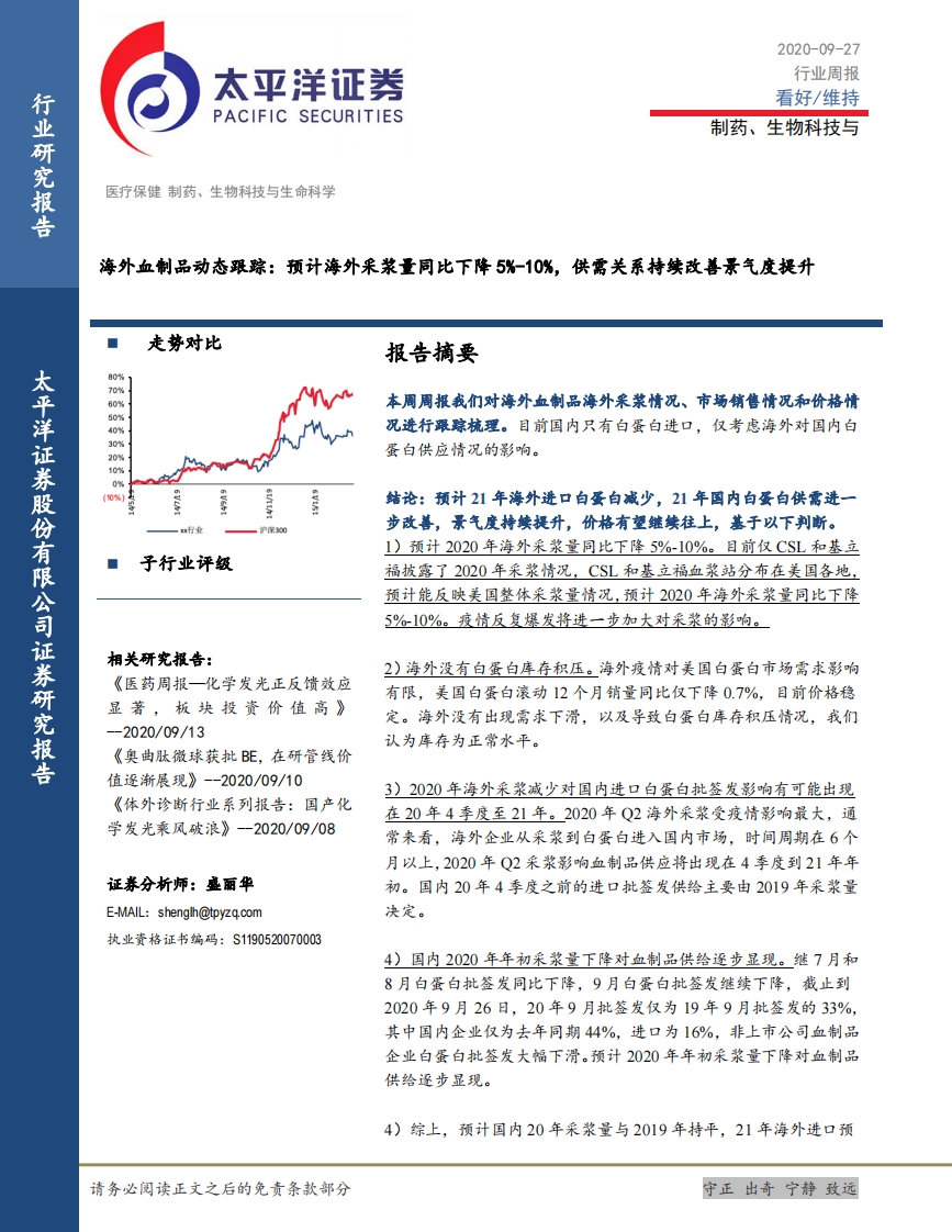 海外血制品動(dòng)態(tài)跟蹤:預(yù)計(jì)海外采漿量同比下降5%-10%,供需關(guān)系持續(xù)改善景氣度提升