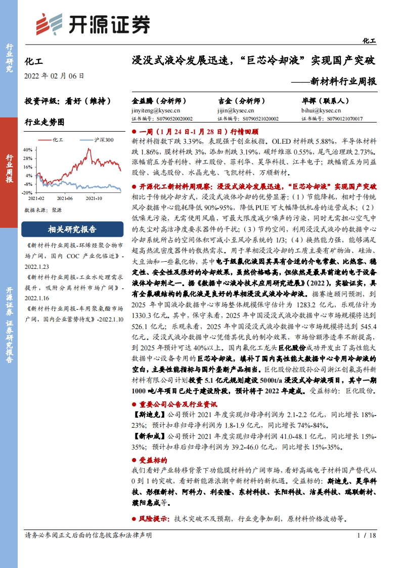 新材料行業(yè)周報(bào):浸沒式液冷發(fā)展迅速,“巨芯冷卻液”實(shí)現(xiàn)國產(chǎn)突破
