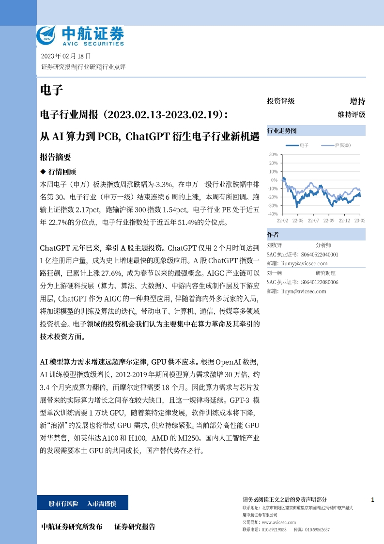 2023-02-19-中航證券--電子行業(yè)周報:從AI算力到PCB,ChatGPT衍生電子行業(yè)新機遇