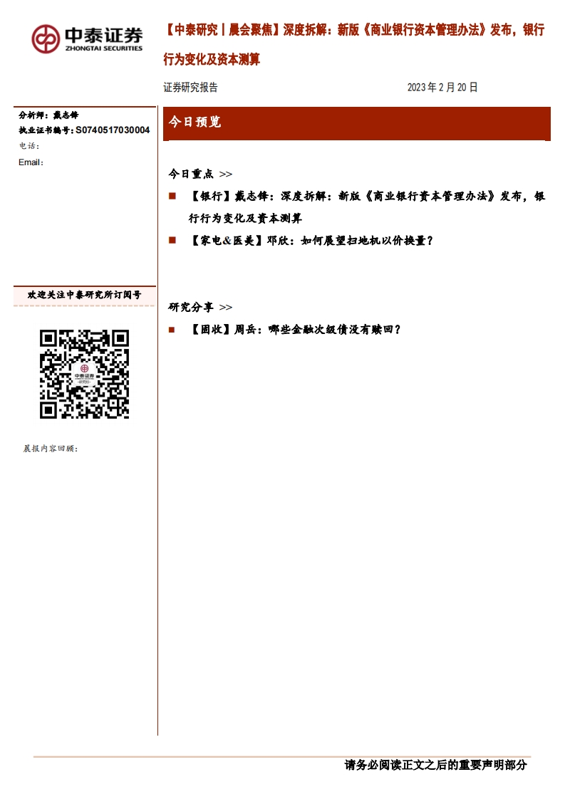 2023-02-21-中泰證券-【中泰研究丨晨會聚焦】深度拆解:新版《商業(yè)銀行資本管理辦法》發(fā)布,銀行行為變化及資本測算