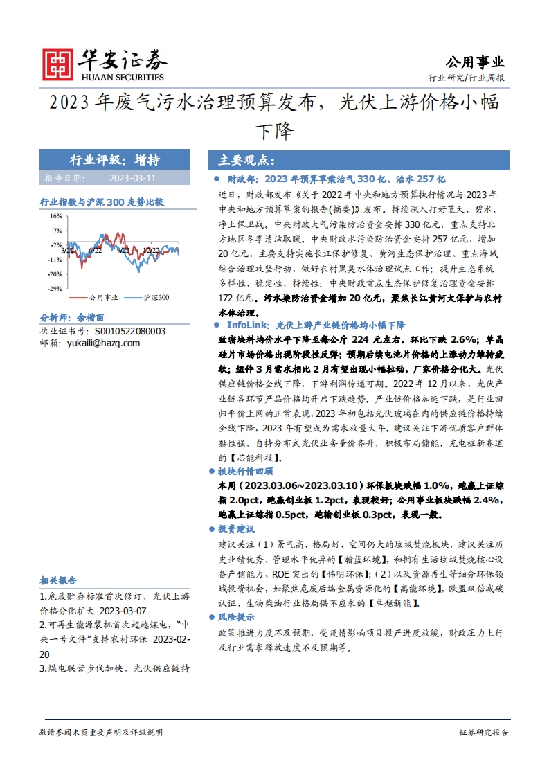 2023-03-12-華安證券--公用事業(yè)行業(yè)周報(bào):2023年廢氣污水治理預(yù)算發(fā)布,光伏上游價(jià)格小幅下降