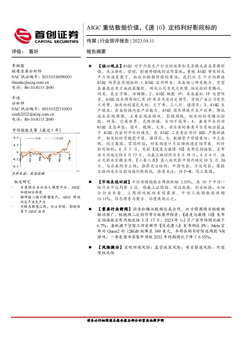 2023-04-12-首創(chuàng)證券--傳媒:AIGC重估數(shù)據(jù)價(jià)值,《速10》定檔利好影院標(biāo)的