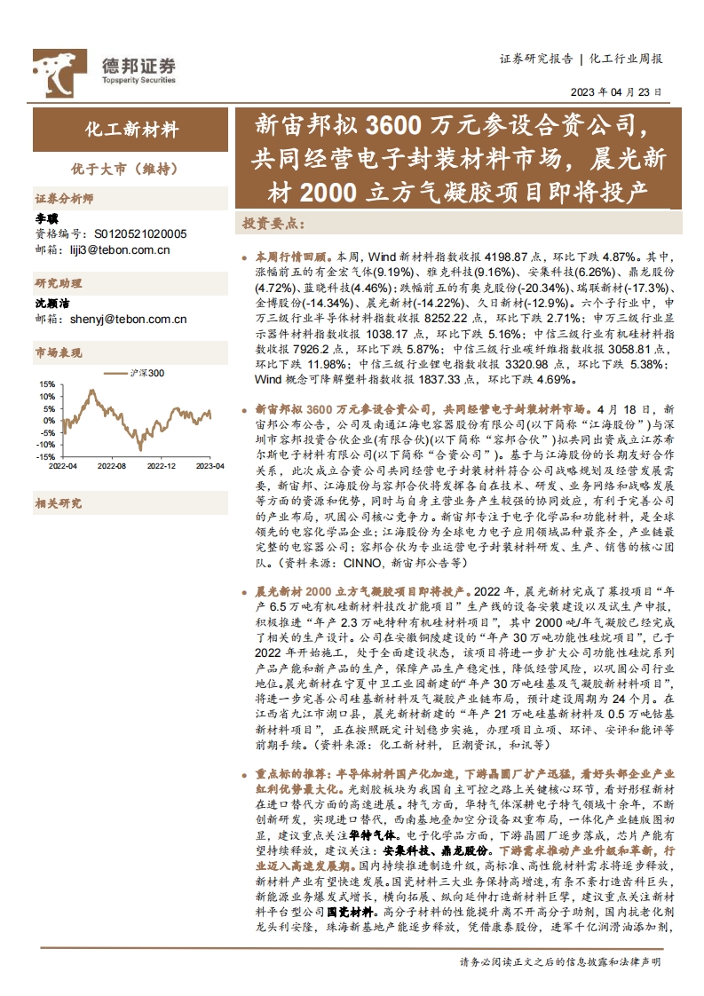 2023-04-24-德邦證券--化工行業(yè)周報(bào):新宙邦擬3600萬(wàn)元參設(shè)合資公司,共同經(jīng)營(yíng)電子封裝材料市場(chǎng),晨光新材2000立方氣凝膠項(xiàng)目即將投產(chǎn)