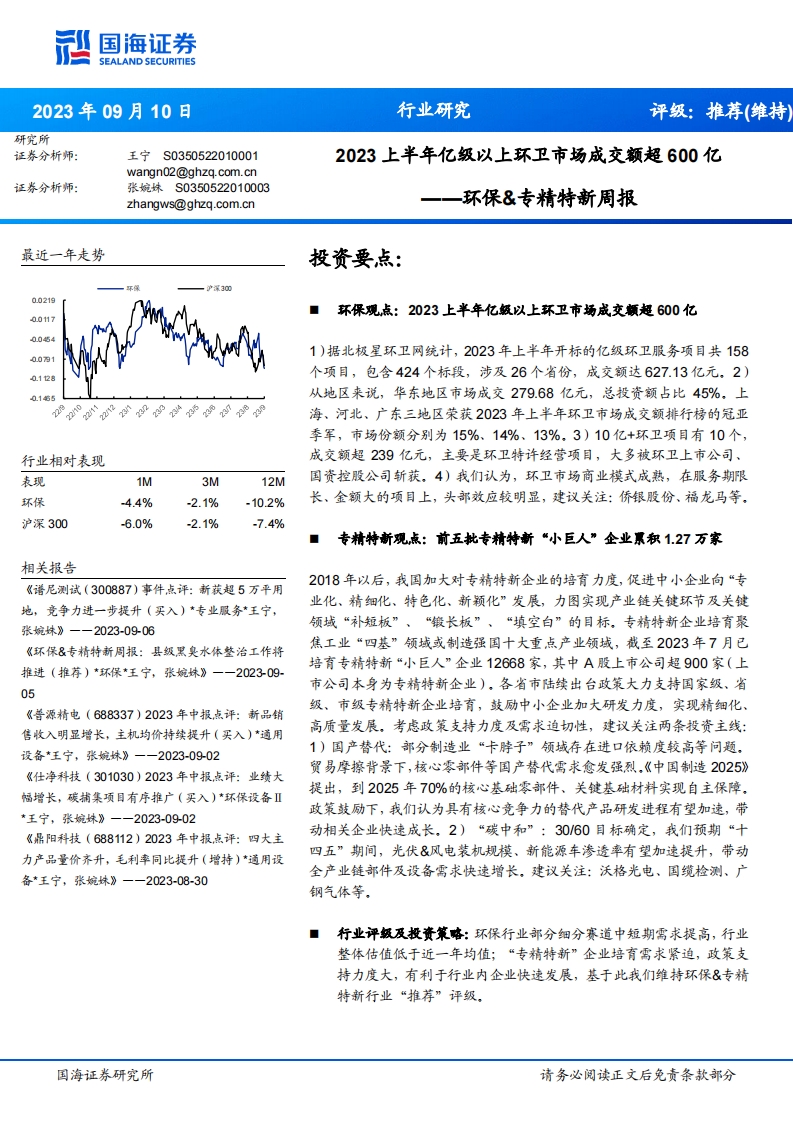 2023-09-11-國(guó)海證券--環(huán)保&專精特新周報(bào):2023上半年億級(jí)以上環(huán)衛(wèi)市場(chǎng)成交額超600億