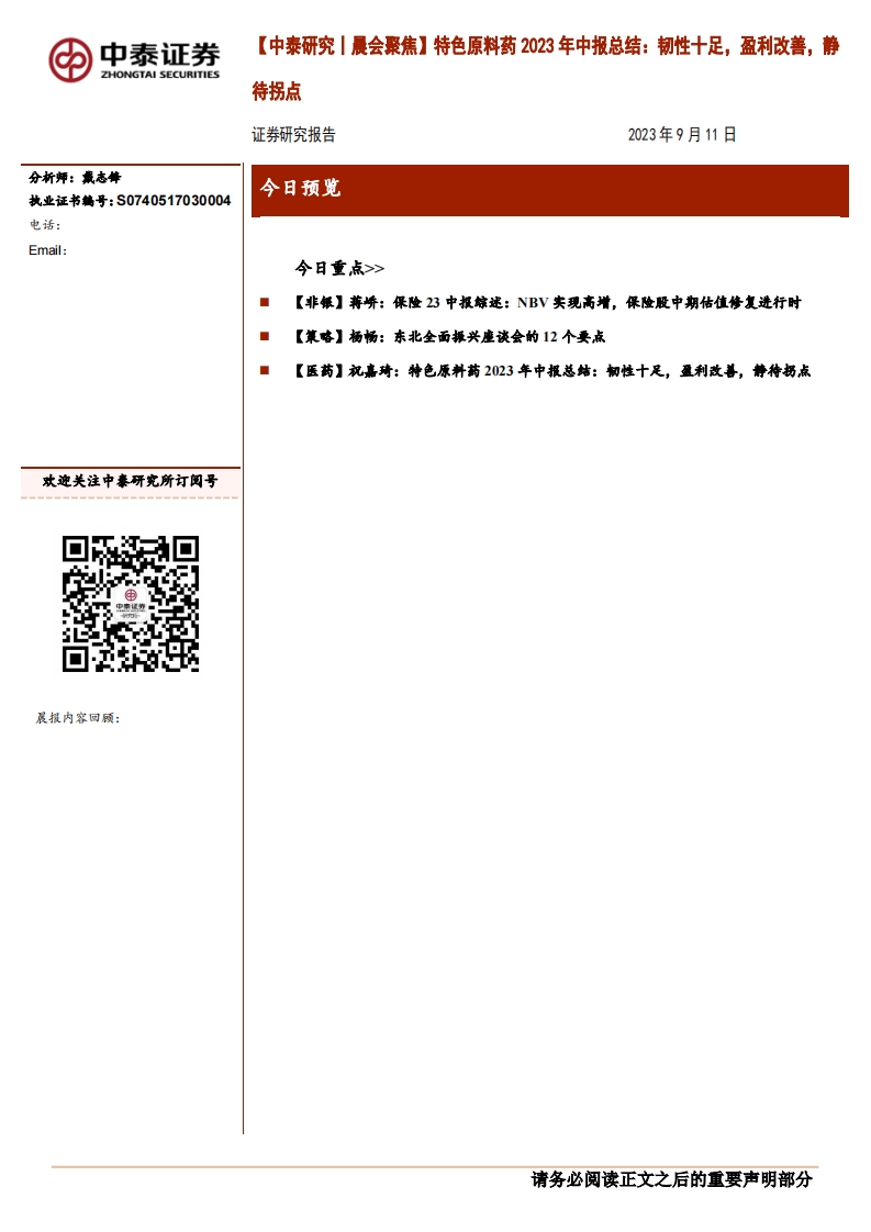 2023-09-12-中泰證券-【中泰研究丨晨會(huì)聚焦】特色原料藥2023年中報(bào)總結(jié):韌性十足,盈利改善,靜待拐點(diǎn)