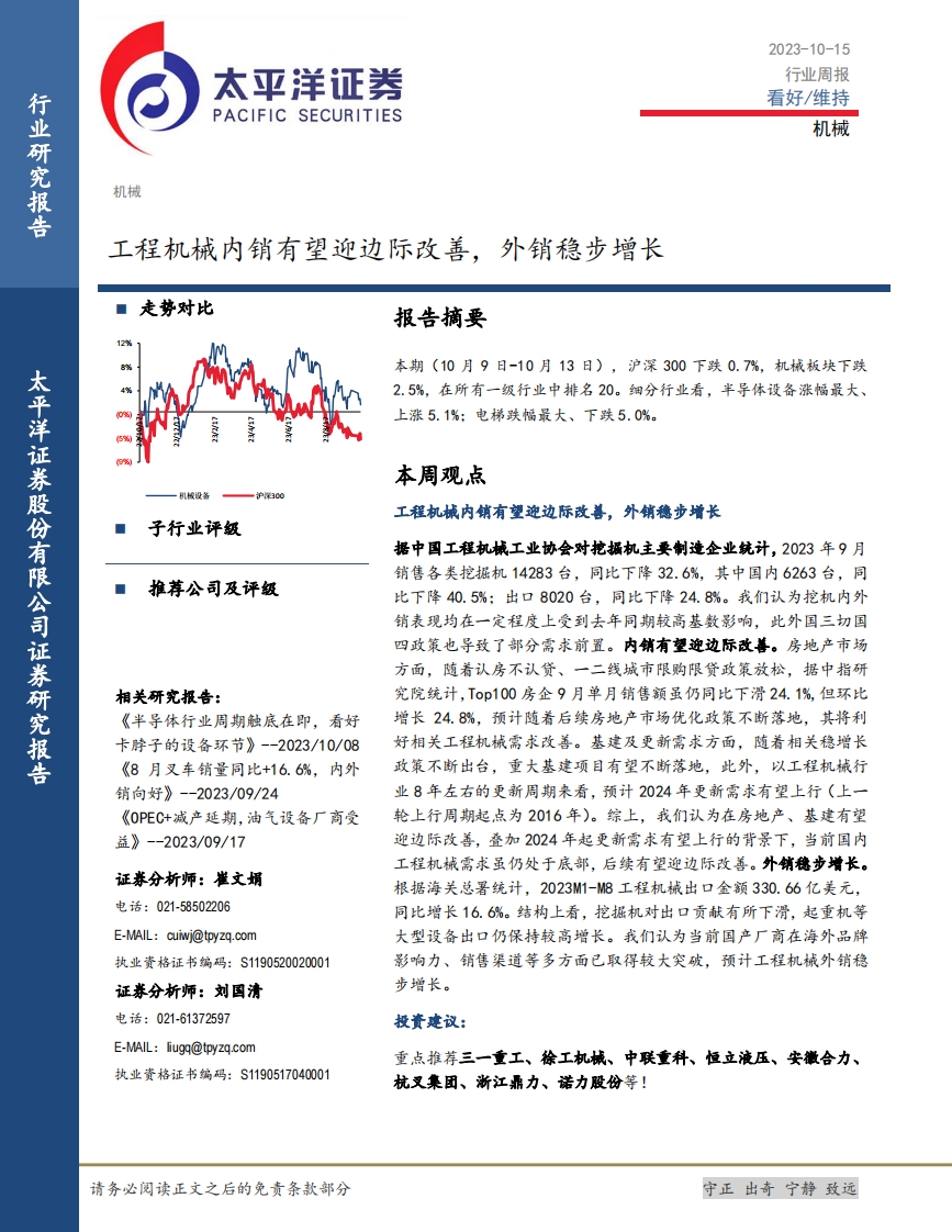 2023-10-16-太平洋--機械行業(yè)周報:工程機械內銷有望迎邊際改善,外銷穩(wěn)步增長
