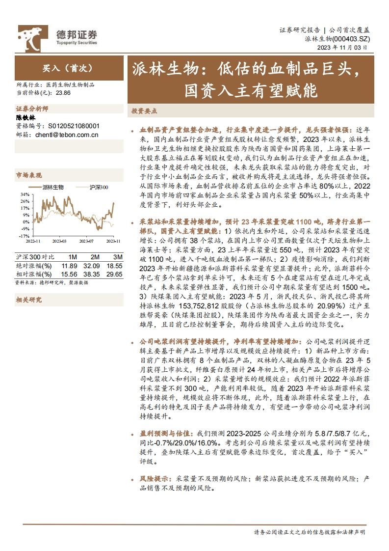 2023-11-03-德邦證券-派林生物-派林生物:低估的血制品巨頭,國資入主有望賦能