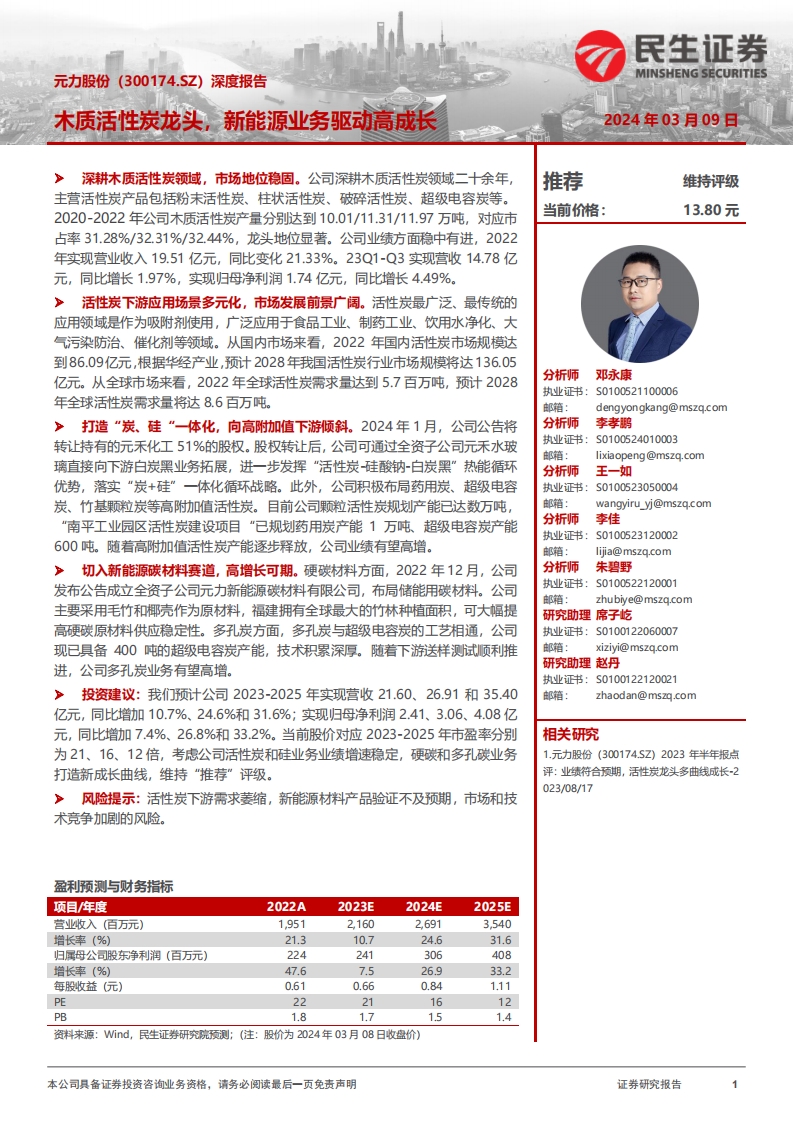 2024-03-10-民生證券-元力股份-深度報告:木質(zhì)活性炭龍頭,新能源業(yè)務(wù)驅(qū)動高成長