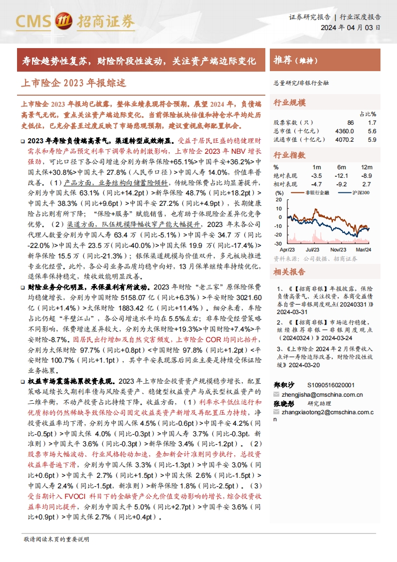招商證券-非銀行金融行業(yè)上市險(xiǎn)企2023年報(bào)綜述:壽險(xiǎn)趨勢性復(fù)蘇,財(cái)險(xiǎn)階段性波動(dòng),關(guān)注資產(chǎn)端邊際變化-240403